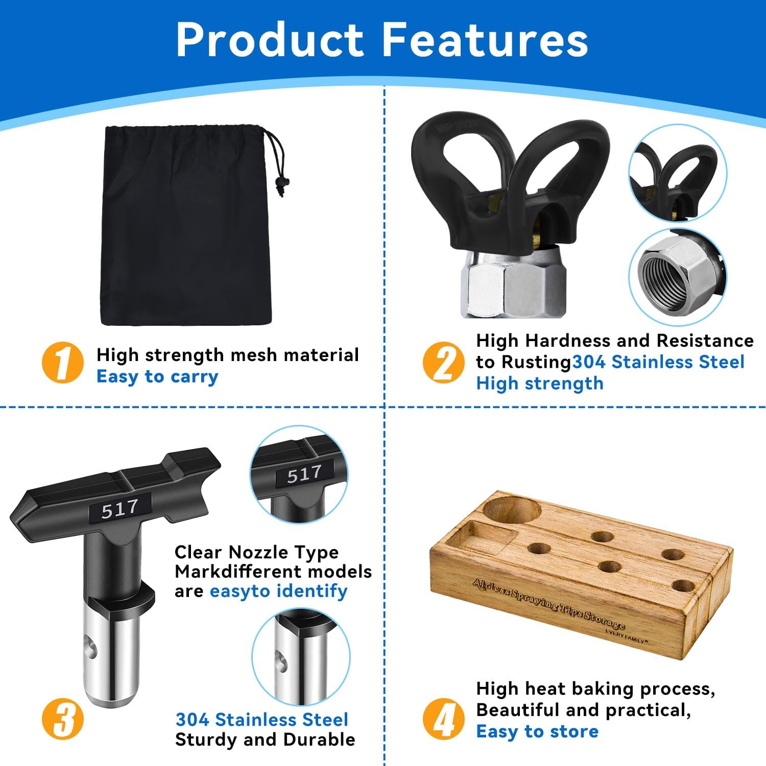 【Package contents】5 pcs different models of spray tips(211,313,415,517,623) ,1 tip guard, Wooden Airless Spray Tip Organizer and black bag