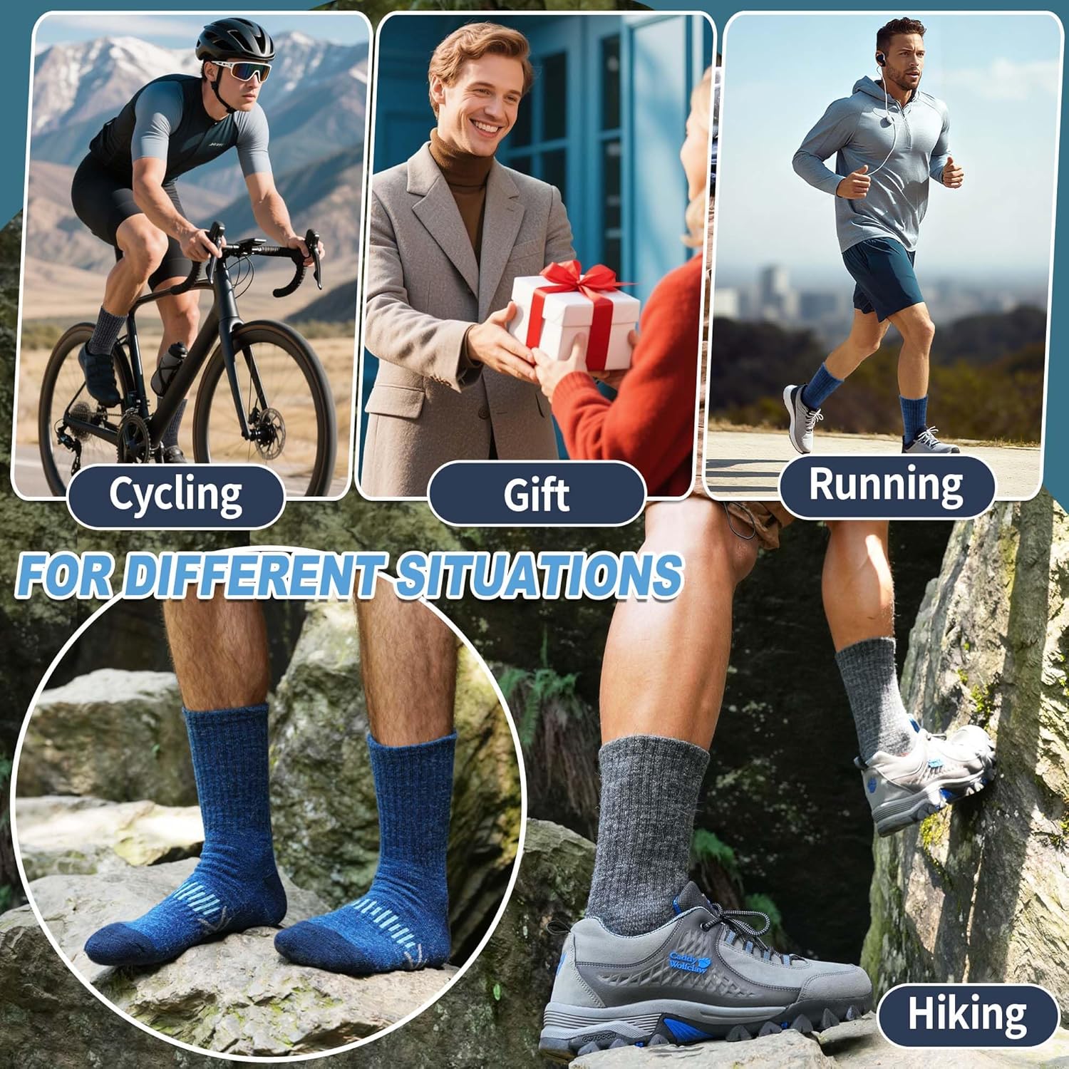 The video showcases the product in use.The video guides you through product setup.The video compares multiple products.The video shows the product being unpacked. Merino Wool Hiking Socks Merchant Video