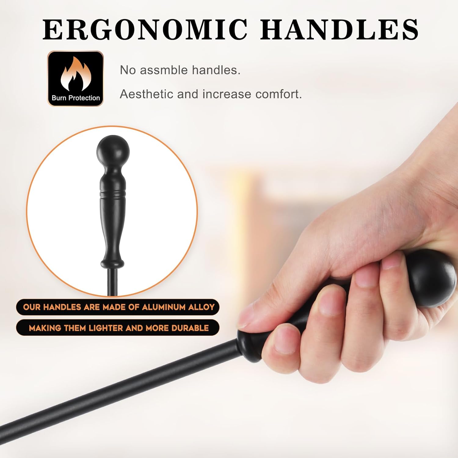 【ERGONOMIC DESIGN】Each of our outdoor fireplace kit has its own unique, comfortable and ergonomic handle. Not only easy to grasp but also can reduce the fatigue and pressure on hands and wrists. Use our modern fireplace accessories to improve the design aesthetics and style of your house. They will seamlessly integrate into any environment, the modern design style improves the visual effect and warms your winter with the fireplace.