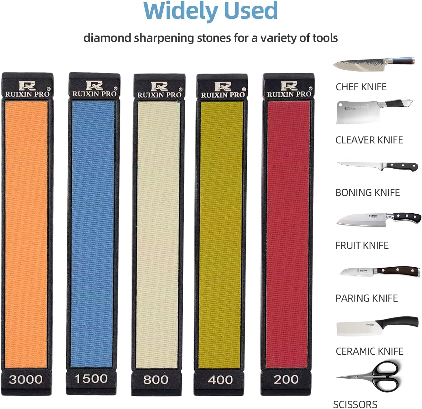 Versatile Sharpening Solution: Effectively sharpens a wide range of blades including tough high-carbon steel, stainless steel kitchen knives (chef knives, paring knives), pocket knives, scissors, tools, and razors. Handles both reprofiling (coarse grits) and fine edge refinement. Our diamond sharpening stones are designed to integrate seamlessly with the Ruixin Pro platformand are compatible with a variety of other fixed-angle sharpening systems for secure, precise sharpening angles.