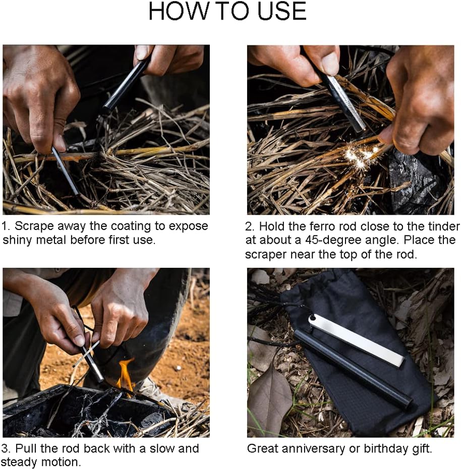 Works In All Weather: This reliable fire-starting tool will work in rainy, stormy, snowy, foggy or windy weather.Produces Ultra-Hot Sparks: Our tactical ferro rod will produce 5500ºF (3,000ºC) F sparks that will work at any altitude.Long-Lasting Design: The survival fire starter ferro rod will last for approximately 15,000 strikes!Perfect Camping Multitool: Perfect emergency fire starter for Bushcraft, Hiking, Hunting, Fishing, Camping, EDC, Emergency, BBQ, Gas Camp Stoves, etc.