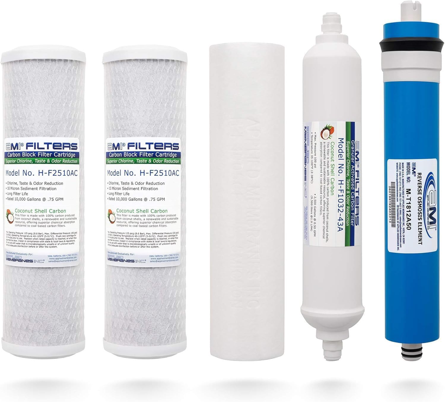 Change RO System filters and RO membrane regularly to experience the Highest Quality Water and Optimum Performance from your Reverse osmosis system.Ordering 5 Stage Reverse Osmosis replacement filters in Packs gives you Substantial Savings compared to ordering water filters individually.Use with any 5-stage Home RO with Standard Housings such as AMI AAA-1005, AAA-505, AAA-RO50W, AAA-RO100W, AAA-RO50A, AAA-RO100A, RCC7, RCC7P, ROES, and hundreds more.AMI 5 Stage RO Filter Replacement Kits take the guesswork out of maintaining your under sink For maximum performance, it is recommended to change all filter cartridges every 3-6 months, post filter every 6-12 months, but replacement schedules will vary with water quality and usage. Generally speaking, filters should be changed when a loss of performance occurs.We are pleased to announce that thanks to customer feedback, AMI filter kits now include universal post filter connections and will work for systems requiring both QC and threaded ends. Use QC adapters (included) for direct-connect to 1/4″ tubing, or remove adapters for use with 1/4″ threaded fittings.