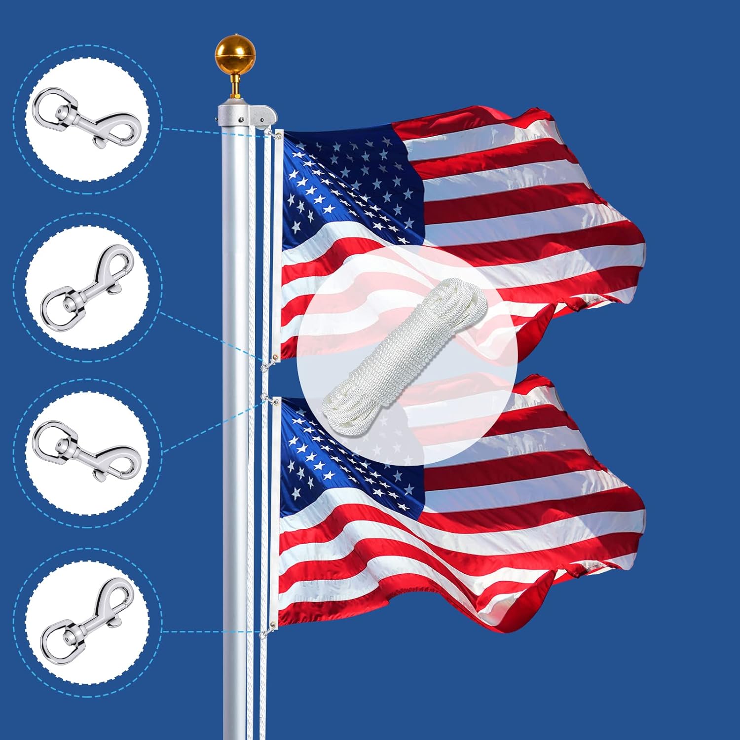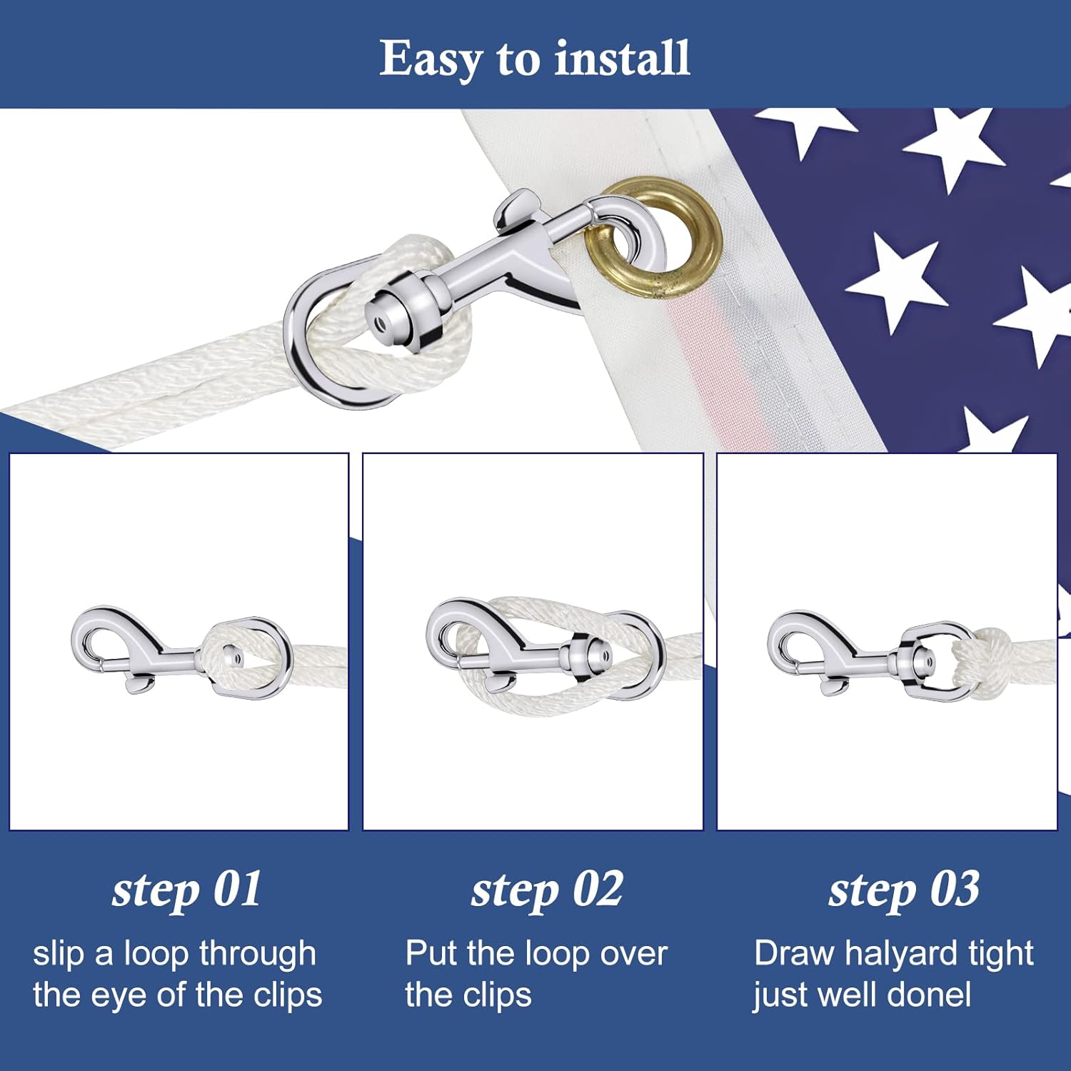 What You Will Get▶ Set contain:1pc 50Ft long x 1/4″ diameter Nylon Flag pole rope & 4pcs Swivel Flag Snap Clips which Length is about 2.5″ and 0.5″ width of halyard eye bolt opening.