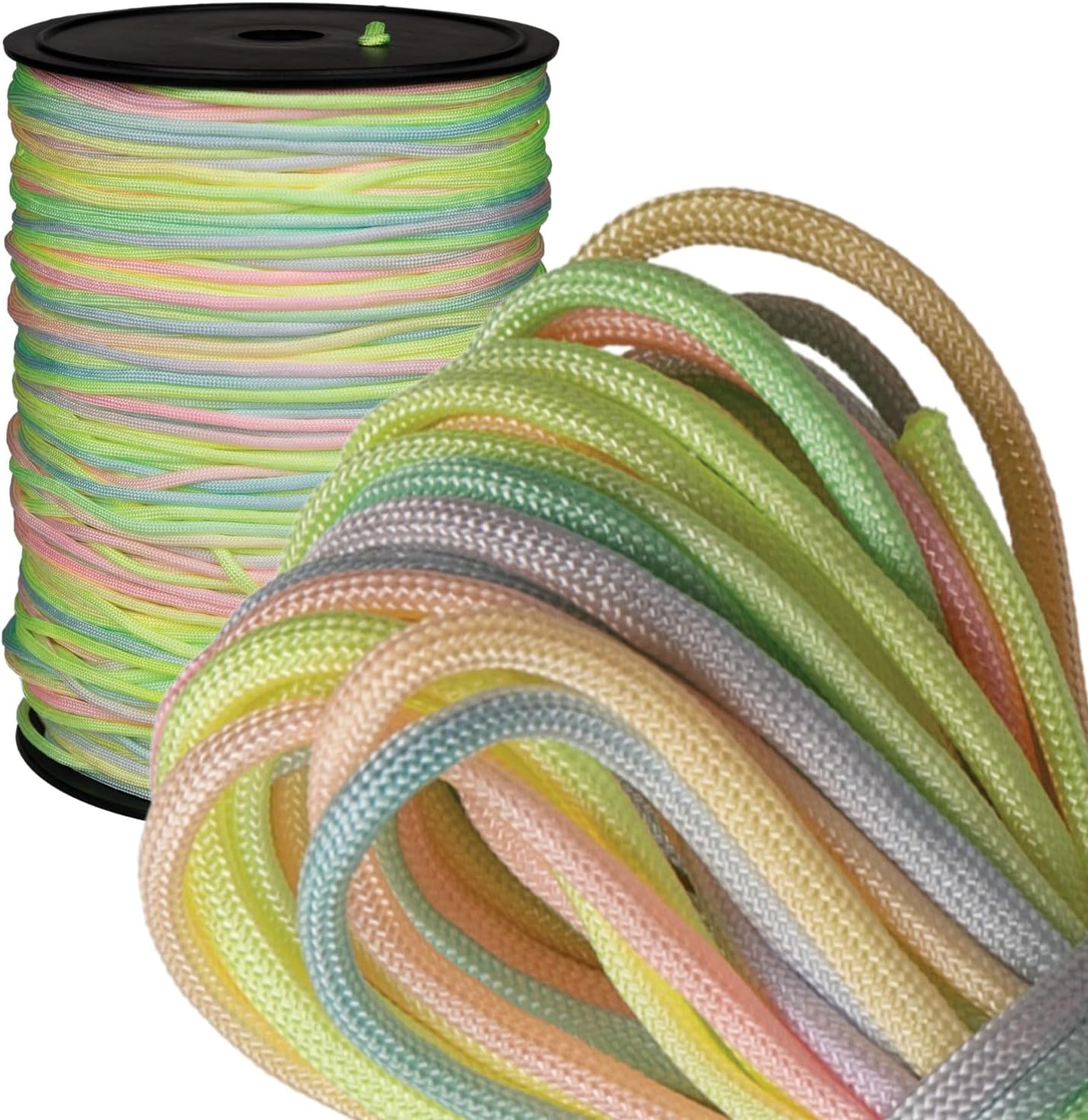 Paracord Planet’s Neon and Pastel Rainbow Dye 550 Paracord is the most vibrant and bright choice for your next beading or macramé craft! This utility cord is made of the highest caliber and most durable parachute cord on the market. It consists of 7 inner strands and is tightly woven with a nylon outer sheath, creating a heavy-duty but lightweight cord that holds up to 550 pounds.