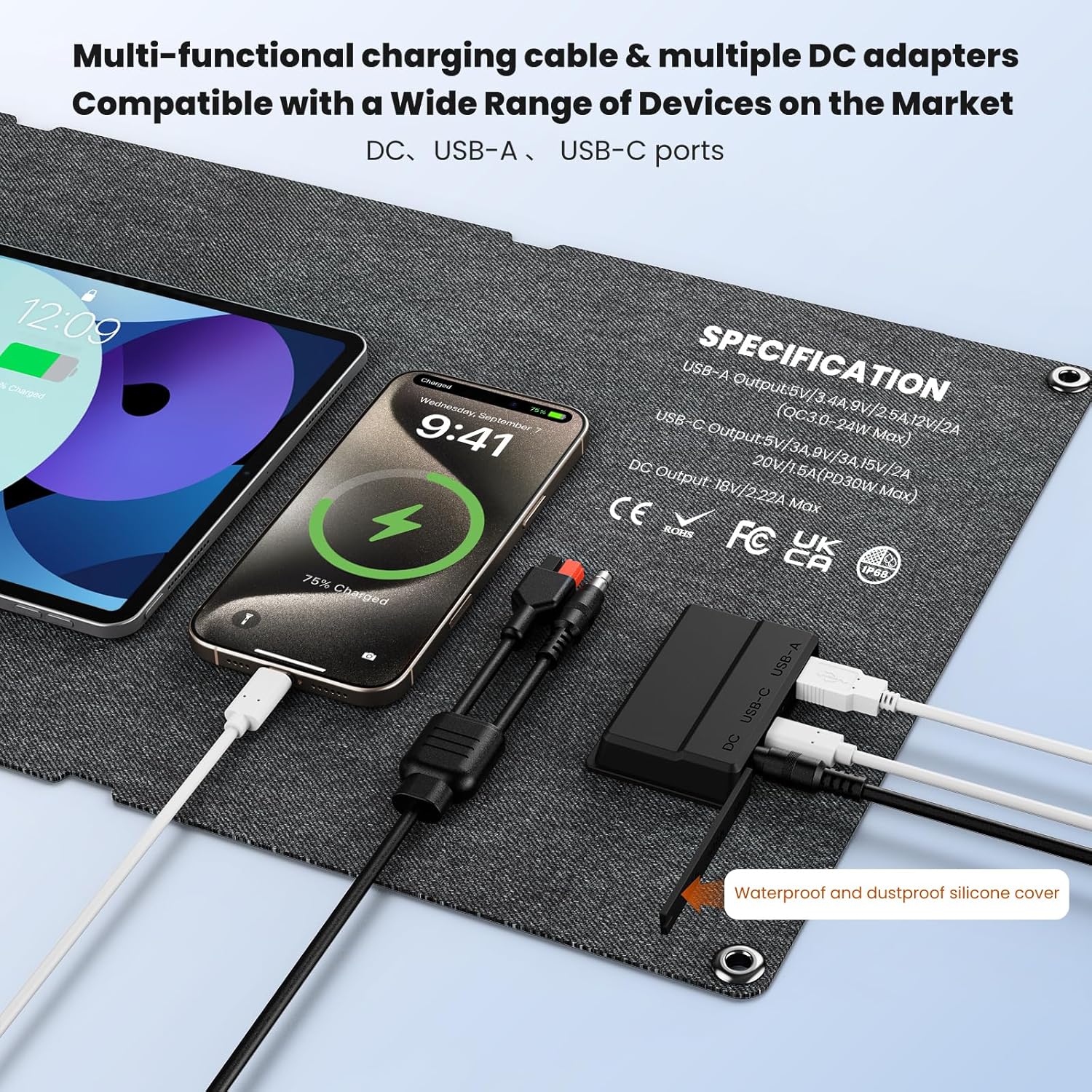 【Wide Compatibility】50W Portable Solar Panel Charger has wide compatibility and versatility.SOKOVOLA foldable solar panel has 3 output ports 1 x QC3.0 USB-A (24W Max), 1 x USB-C (30W Max), 1 x DC (18V/2.77A Max). It can charge smartphones, iPads, digital cameras,GPS,mobile power and other USB devices.