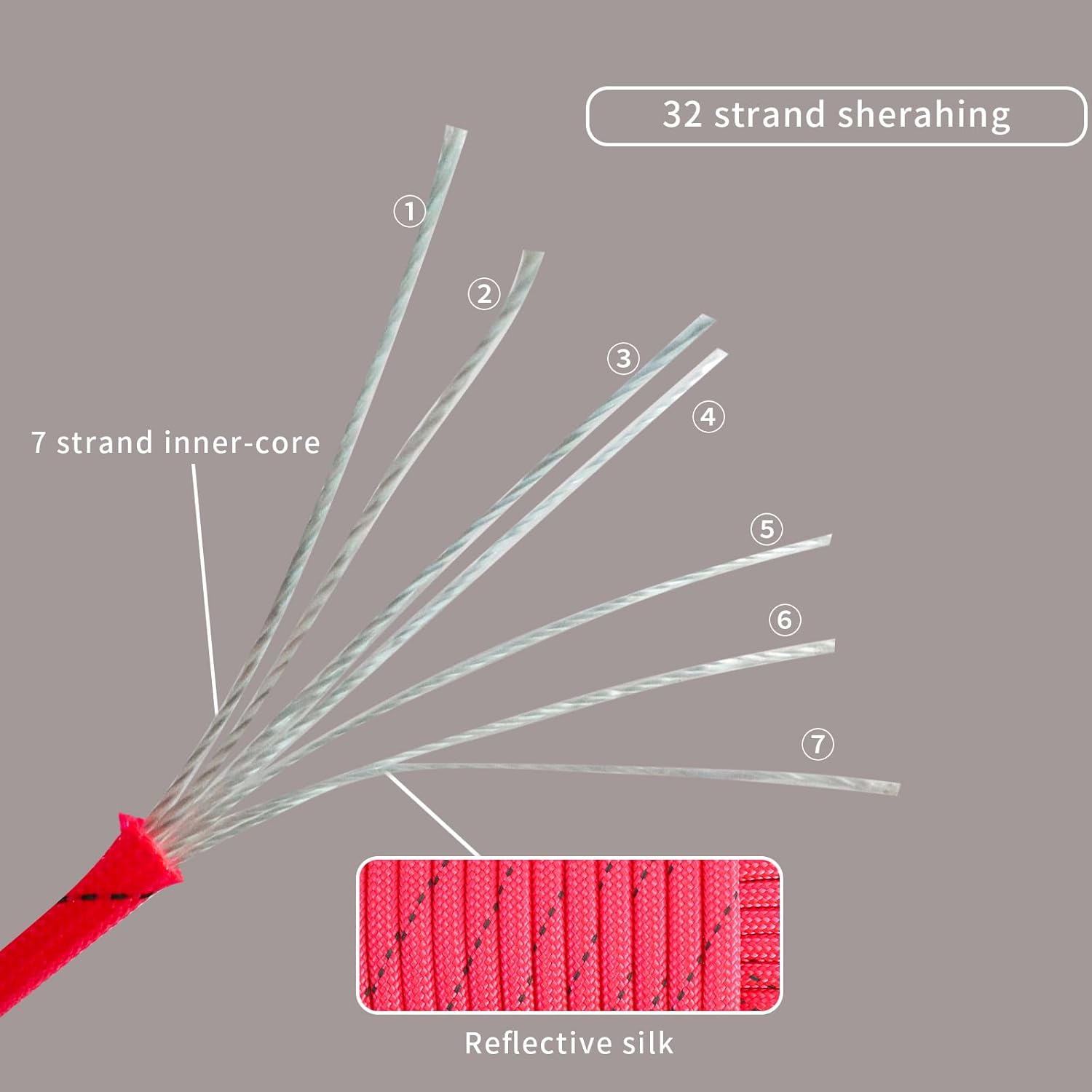 Premium Quality Paracord: Our paracord features a sturdy 32 strand braided sheath and 7 core yarns each made of 3 twisted nylon fibers, Its tested tensile strength of 550lbs. The outer layer is tear-resistant, providing stable performance for outdoor fixing, bundling and other scenarios.