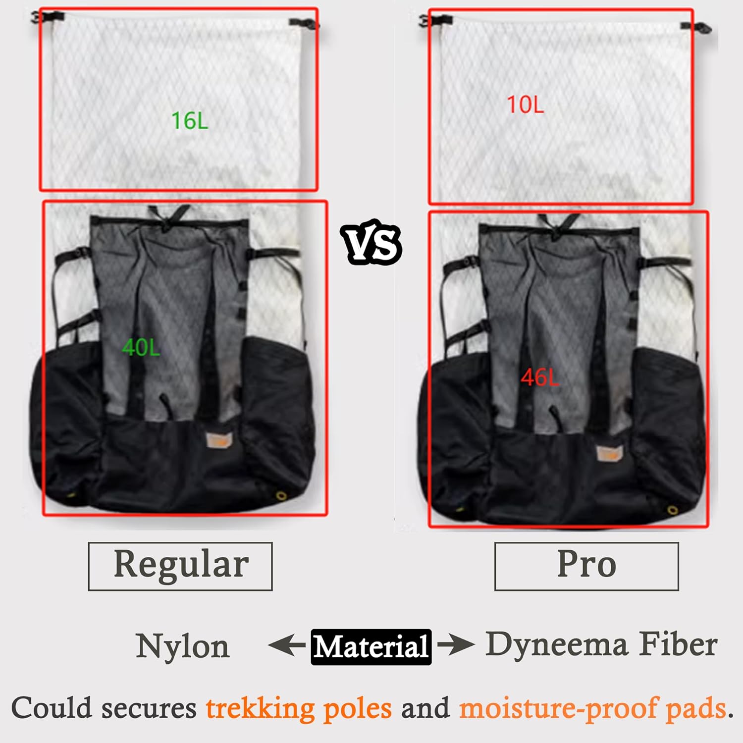 LIGHTWEIGHT: The lightweight backpacking backpack is made of durable water resistant Polyester. It weights 1.87lb(Reguar)/1.94lb(Pro) only. And the regular is the nylon fabric, the pro is the Dyneema Fiber. Featuring its classic silhouette,the convenient and comfortable pack is great for Backpacking use.