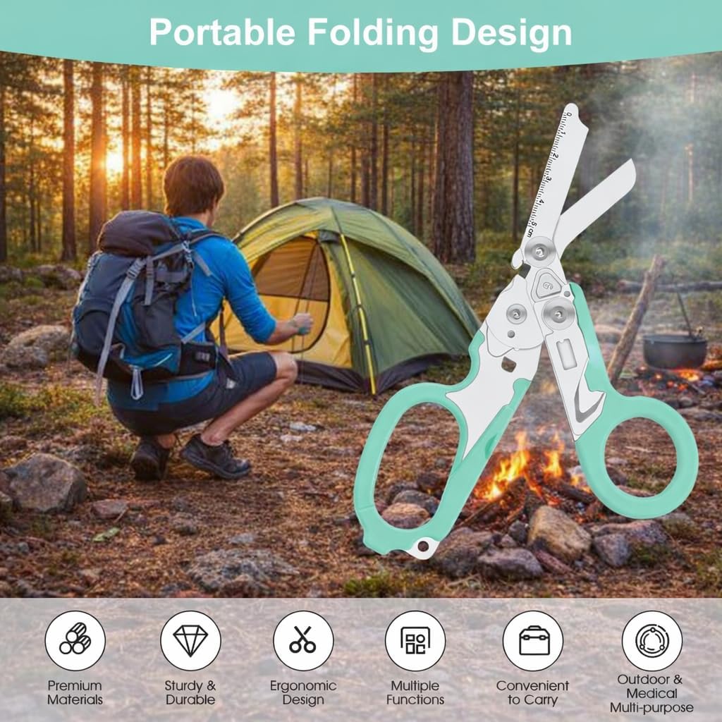 COMPACT & RAPID DEPLOYMENT – Designed for easy carry and swift access, these foldable shears come with a holster that can be worn upside-down on your belt. The innovative design locks the shears securely in place, allowing for one-handed operation and quick deployment when every second counts.