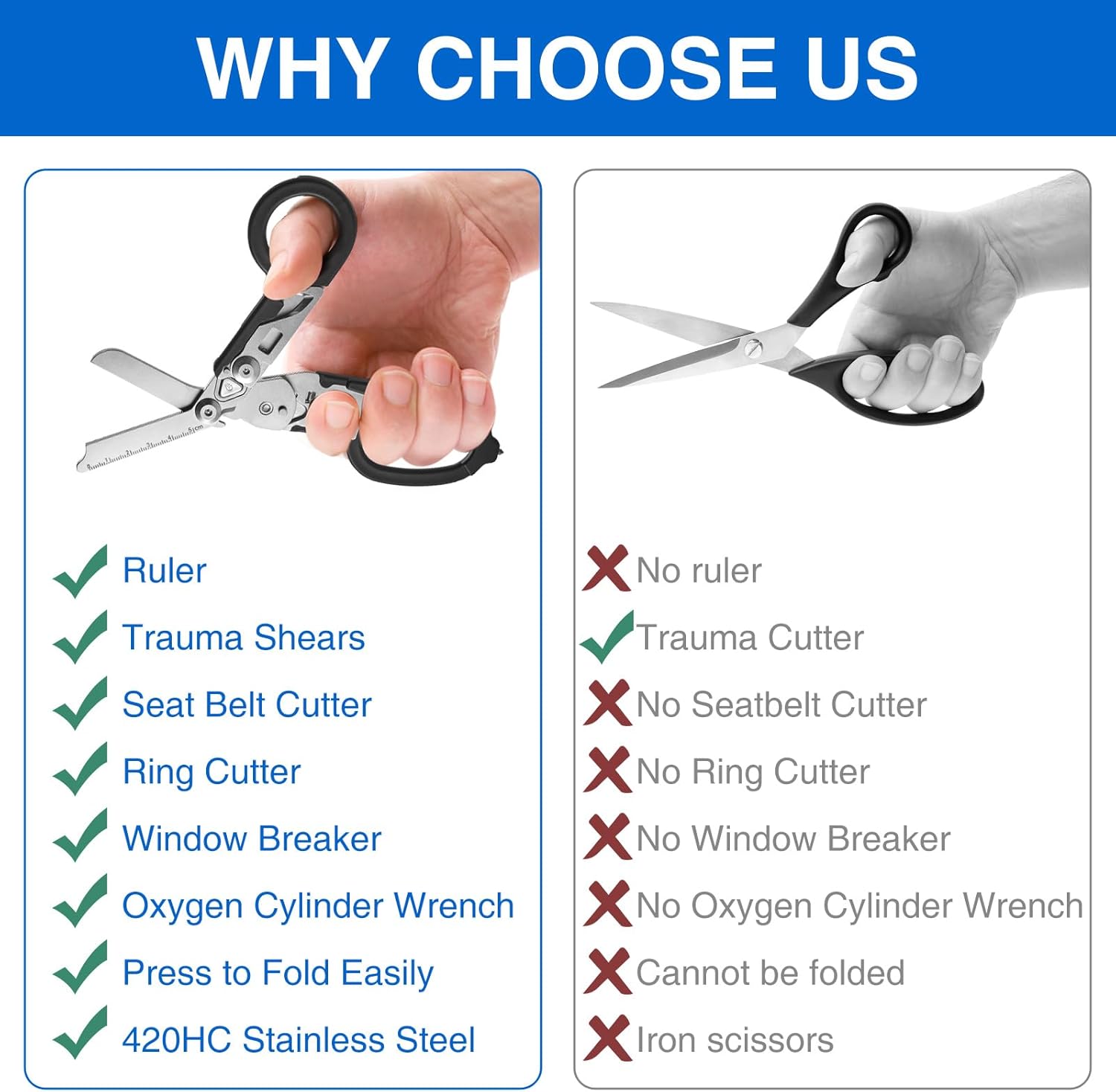 Multi function Trauma Shears :- Foldable trauma shears have 6 basic functions which can be used as trauma shears, belt shears, ring shears, rulers, oxygen tank wrenches and carbonized glass breakers respectively