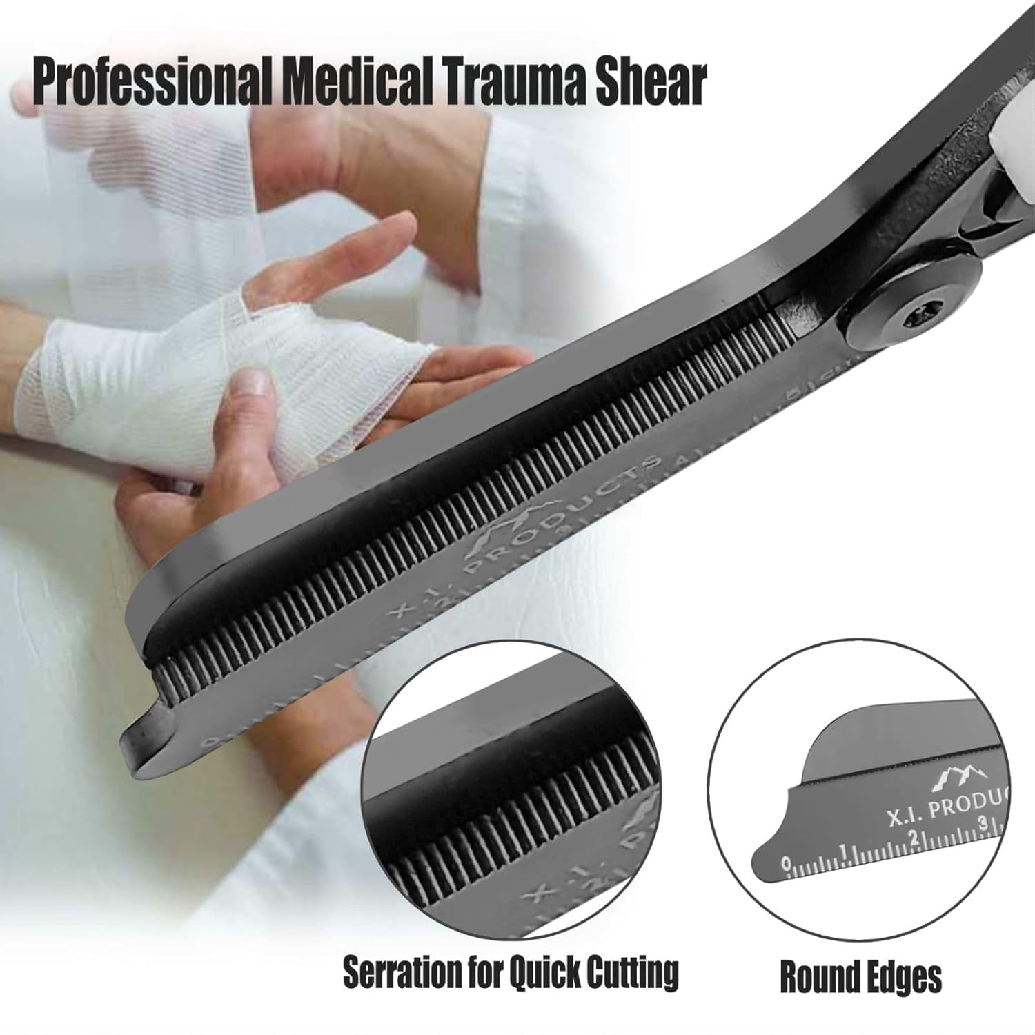 Multi function Trauma Shears: The Foldable trauma shears have 6 basic functions which can be used as trauma shears, belt shears, ring shears, rulers, oxygen tank wrenches and carbonized glass breakers respectively