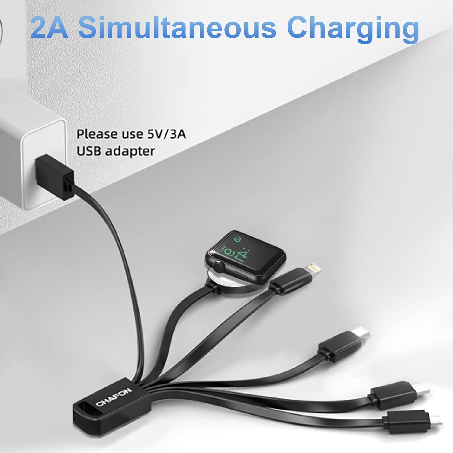 Compatible or Not:CHAFON Multi USB cable is compatible with iPhone 15/14/13/12/11/11 Pro/11 Pro Max/XS; iWatch series Ultra/8/7/6/SE2/SE/5/4/3/2/1; AirPods and iPads; Samsung Galaxy S23 S22 S21 S10 S9 S8 Note 9 8LG G5 G6 V20 Google Pixel Google Nexus 5X 6P other Type-C Android phones.Support to charger most of the mobile devices available on market. CAN’T power your MacBook or any laptops. CAN’T Sync Data.