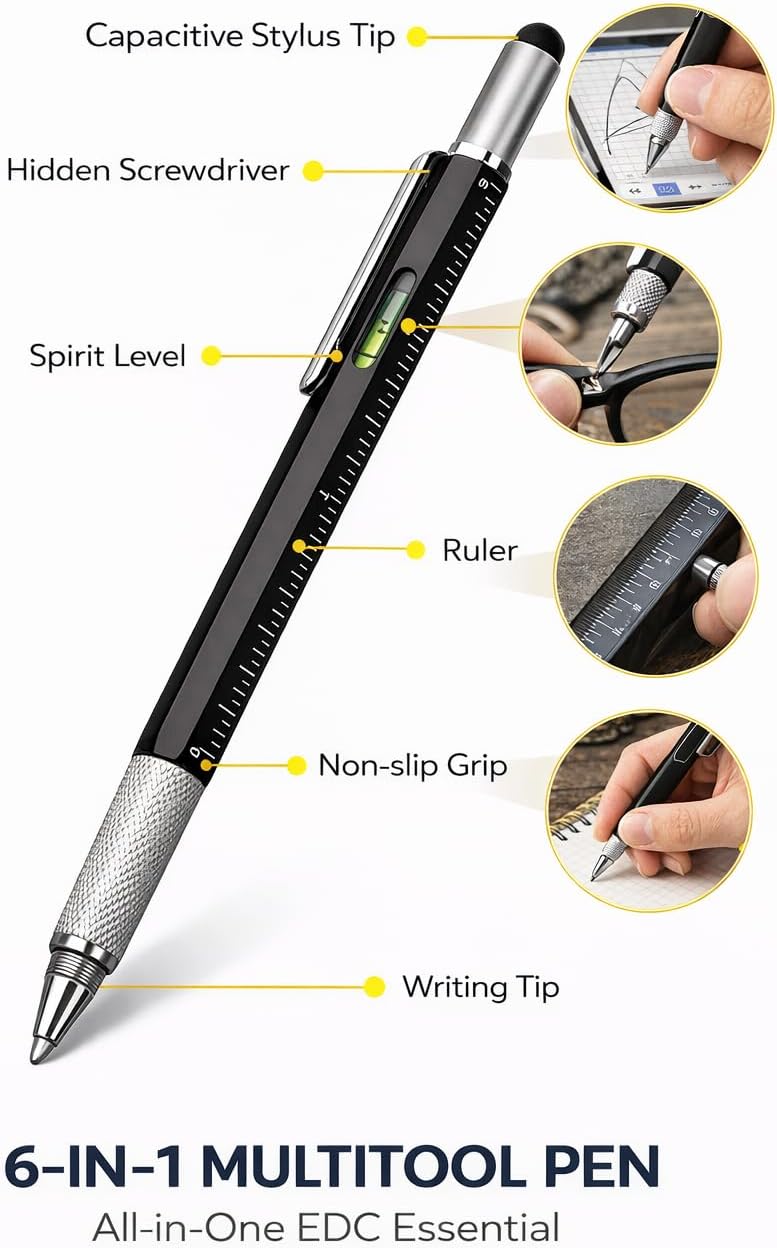🖋️MULTITOOL PEN FOR DAILY TASKS Includes screwdriver bits, ruler markings, stylus tip, and smooth-writing pen. Ideal for quick fixes, measurements, notes, and everyday problem-solving.