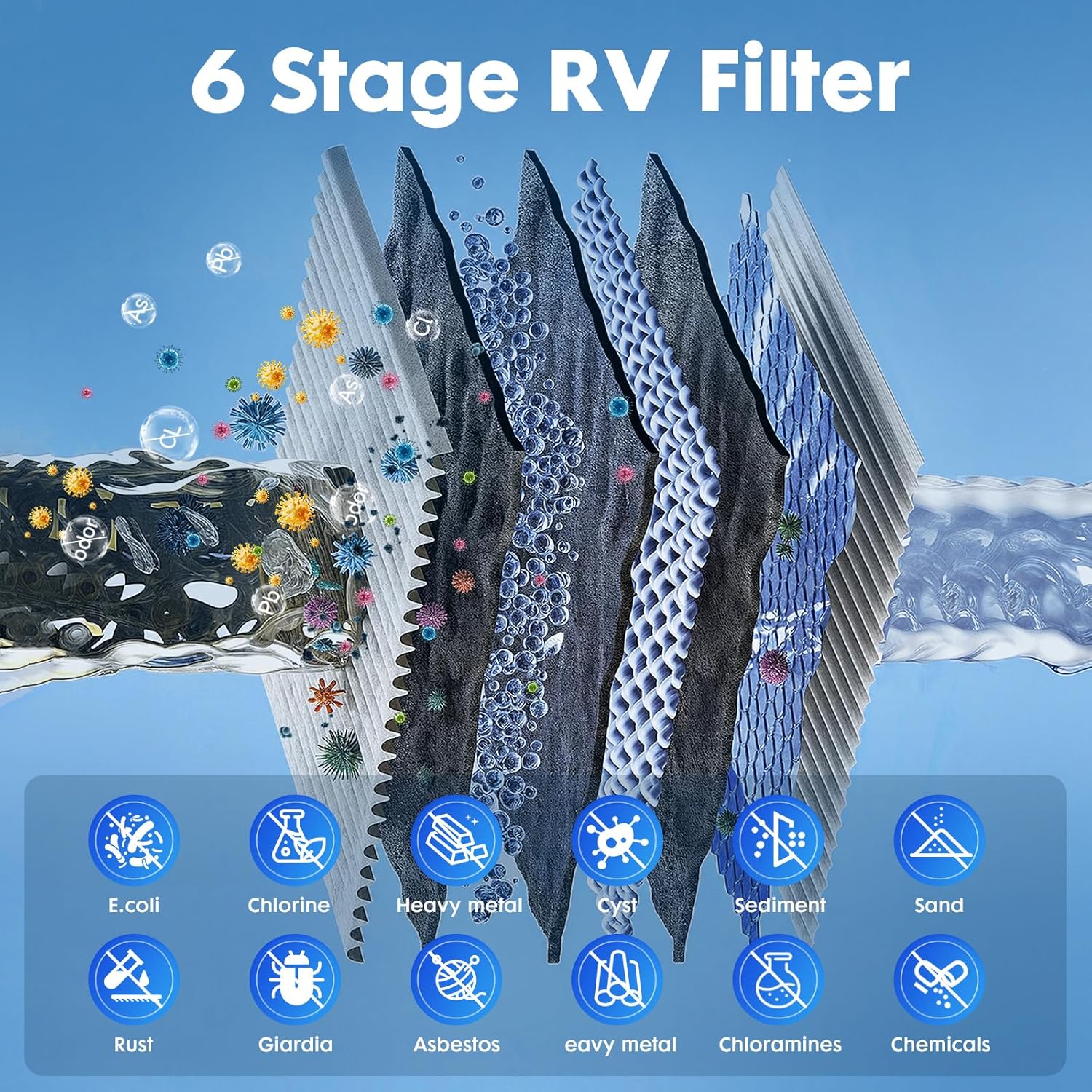 6-Stage RV Water Filter Advanced Filtration:The RV water filter adopts a multi-stage filtration structure, which can remove sediment, chlorine, heavy metals, and pollutants from water,making it the best protector for safe drinking water.