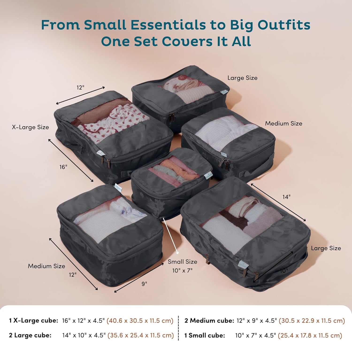 Your Ultimate Travel Organizer – 6 lightweight, compressible packing cubes for travel keep outfits, underwear and accessories neat. Ideal luggage packing cubes for travel, weekend getaways, road trips or daily suitcase organization.