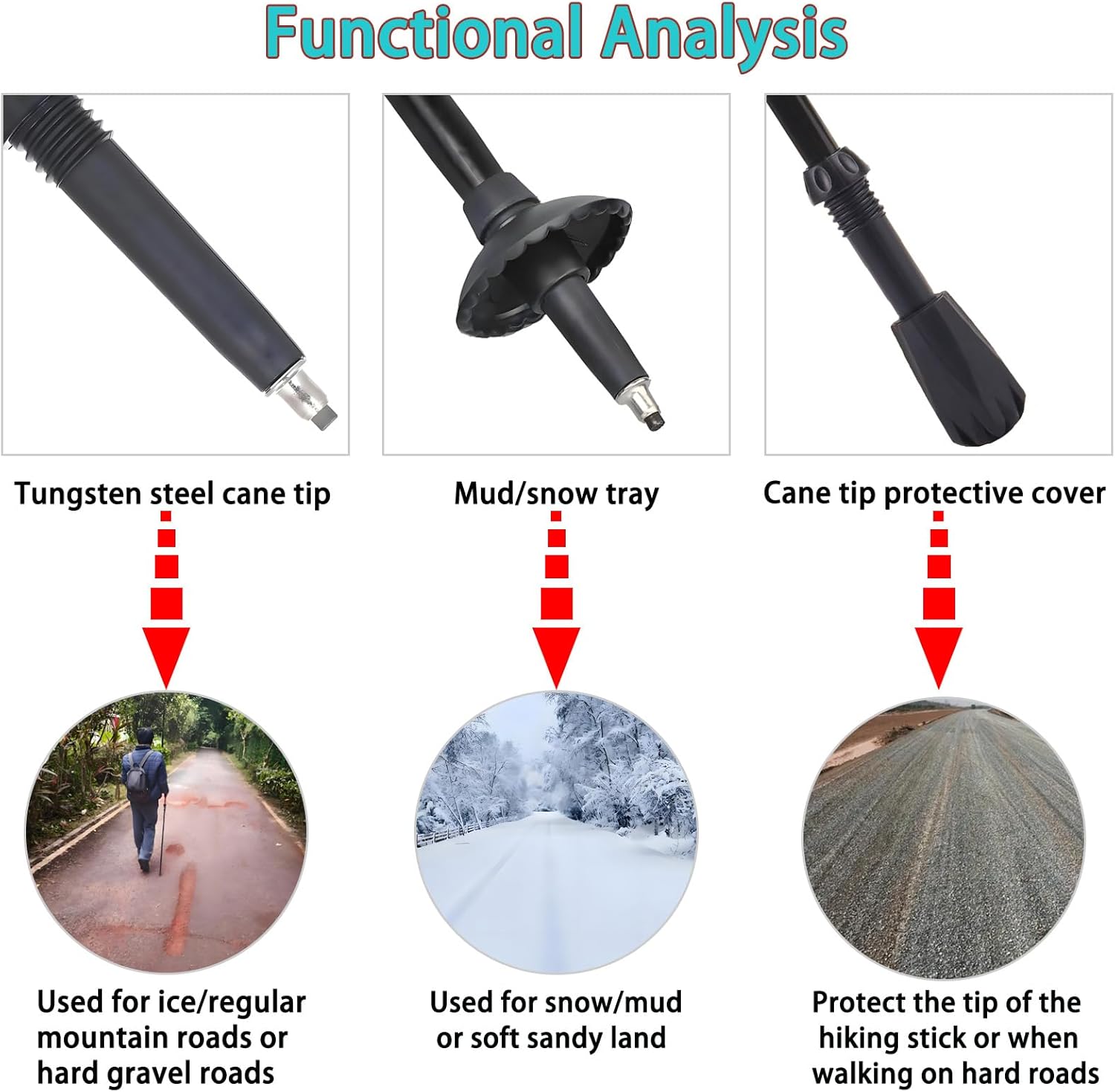 Excellent grip:Use on hard surfaces liked paved trails, roads, sidewalks, or rocky terrain and feel the additional traction from the tips to help prevent slipping and improve stability ,Let your trekking poles and canes walk smoothly on any terrain