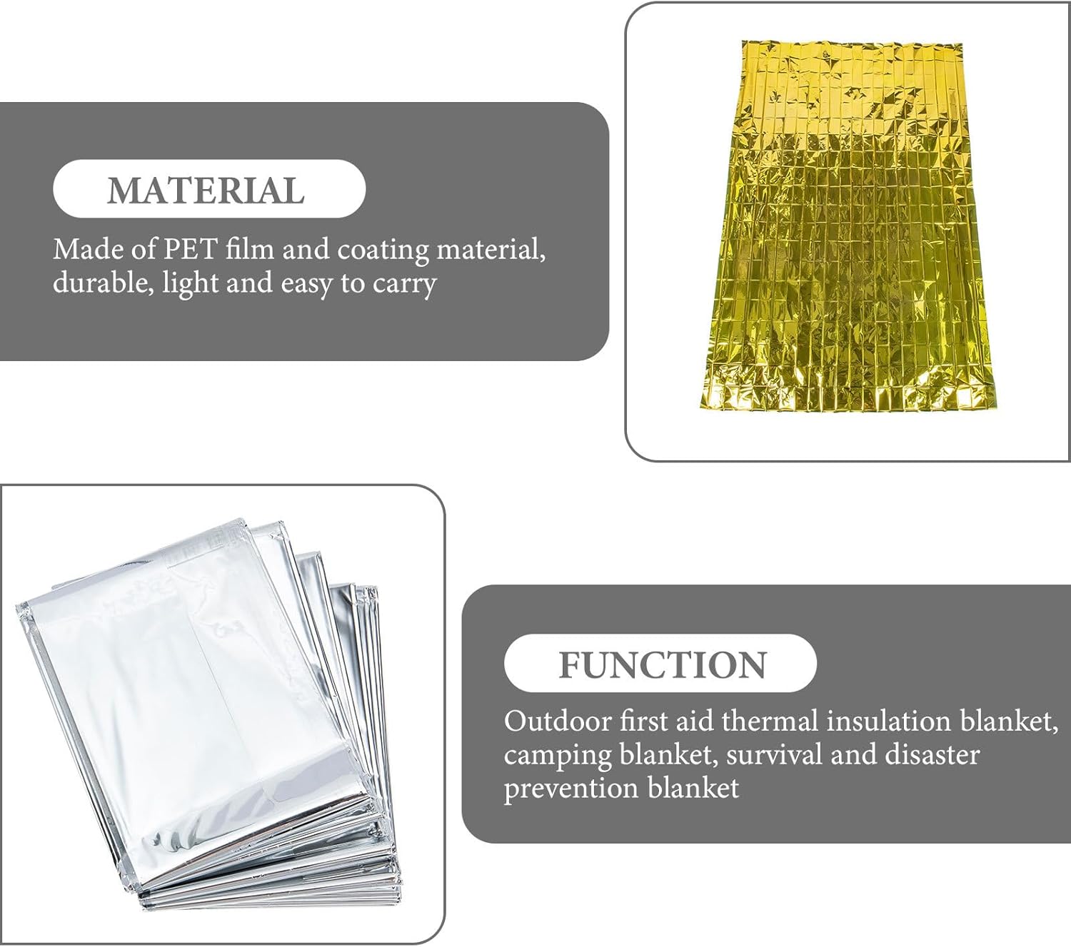 compact reusable survival These emergency blankets keep you warm, good tool for personal survival, emergency etc.emergency heat After an accident, first aid blankets can be used to cover the body to prevent a sharp-drop in body temperature.aluminum foil emergency Emergency blankets are mainly used in to prevent death from