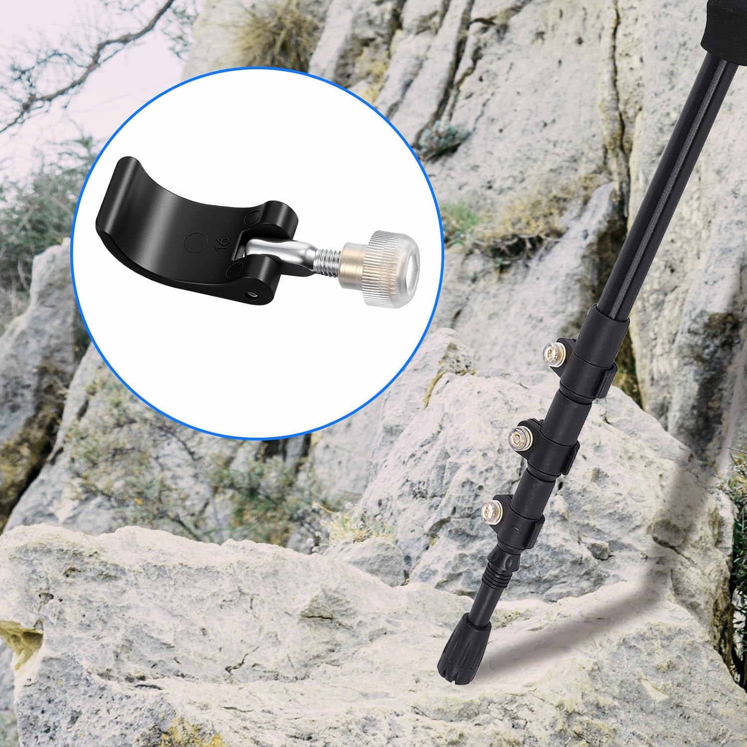 【Premium Materials】Our trekking pole clips are made of high-quality PVC and zinc alloy for durability. The materials offer excellent impact and fatigue resistance, effectively withstanding crushing and collisions in challenging outdoor environments. Climbing pole external locks are not prone to breakage or deformation, ensuring a long service life