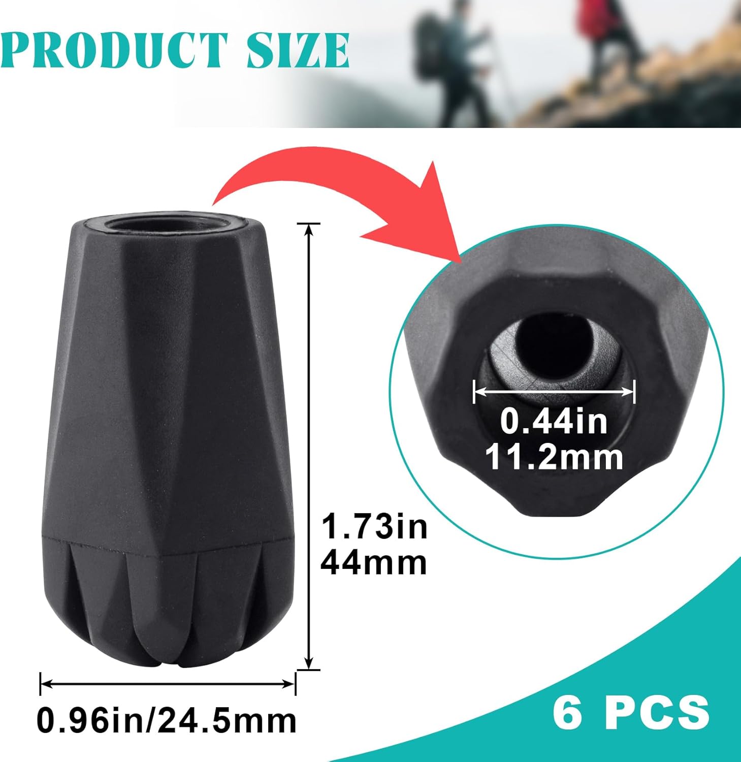 Package Include: You will receive 6pcs trekking pole tips, size: outer diameter 0.96 in/24.5 mm, inner diameter 0.44 in/11.2 mm, length 1.73 in/44 mm, proper size and classic black color is suitable for most walking stick, and sufficient quantity for replacement