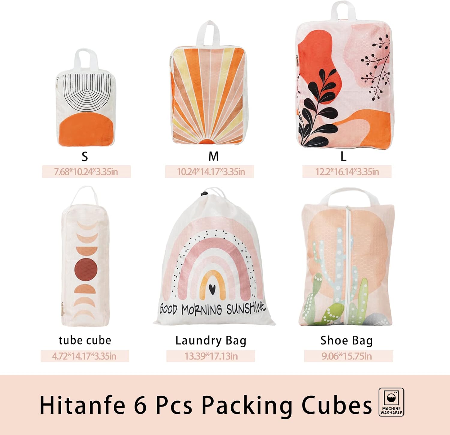Packing Cubes 6 Piece Set: 3 X different size compression packing cubes travel; 1 X makeup bag(tube cube), 1 X travel shoe bag , 1 X drawstring laundry bag . Every seasoned traveler knows that easy access and organization are key, and with these compression travel cubes, packing is a breeze! They save 100% of luggage/bag space, help you categorize your items, and prevent them from getting lost. This also makes airport security checks quick and convenient.