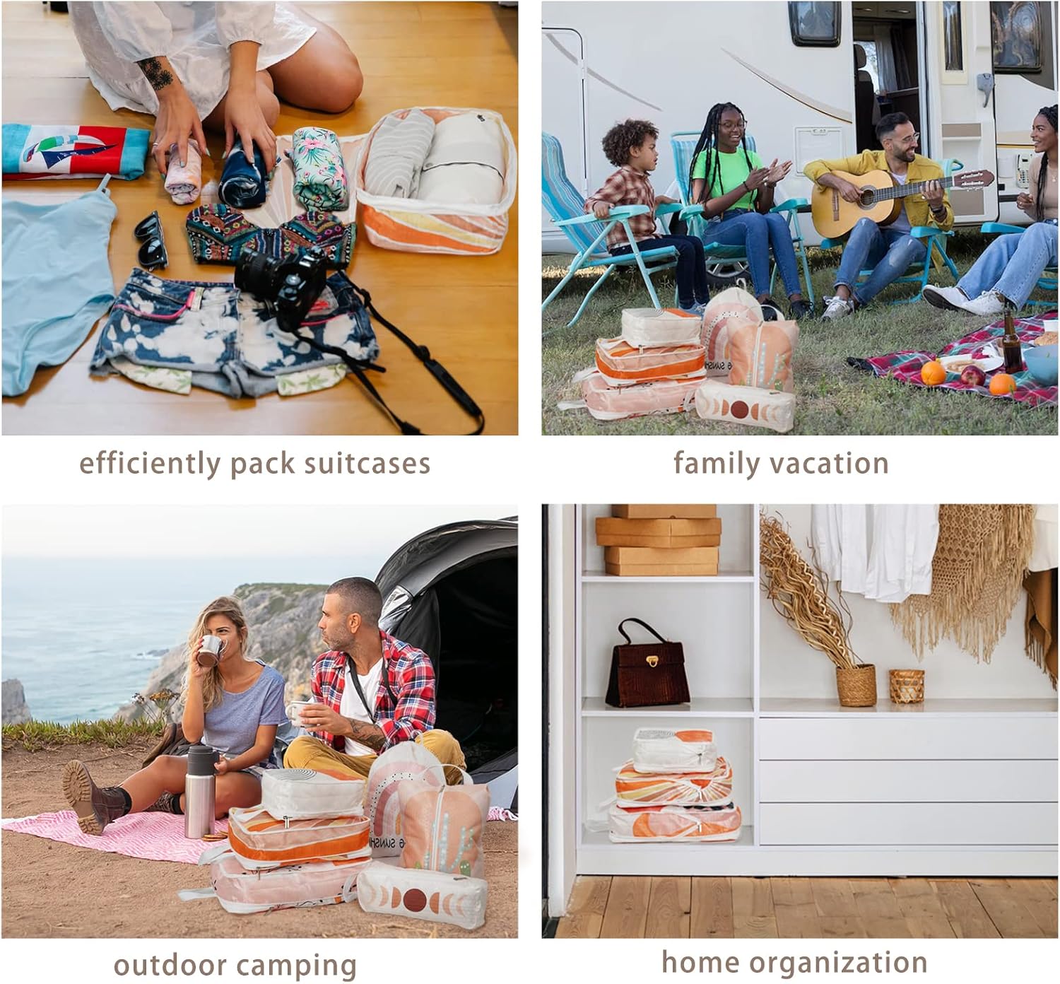 Multi-Functional Compression Packing Cubes: Lightweight, waterproof, portable, foldable, easy to store, suitable for most airlines’carry-on luggage, handbags, weekend backpacks, duffel bags, etc., perfect for family vacations, business travel, holidays, hiking, camping, RVing, and traveling.