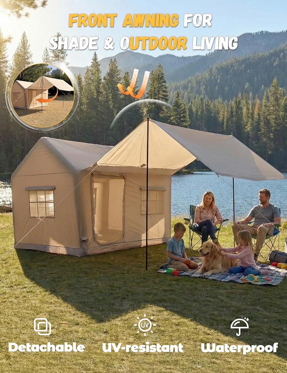 【Spacious 6-Person Inflatable Tent with Front Awning】This 6-person inflatable tent offers generous interior space (9.8 ft × 7.4 ft × 7.5 ft) with a 6.6 ft standing height, allowing most adults to stand comfortably inside. The front awning provides extra shade for cooking or gear storage, making it ideal for family camping, glamping, and extended outdoor stays