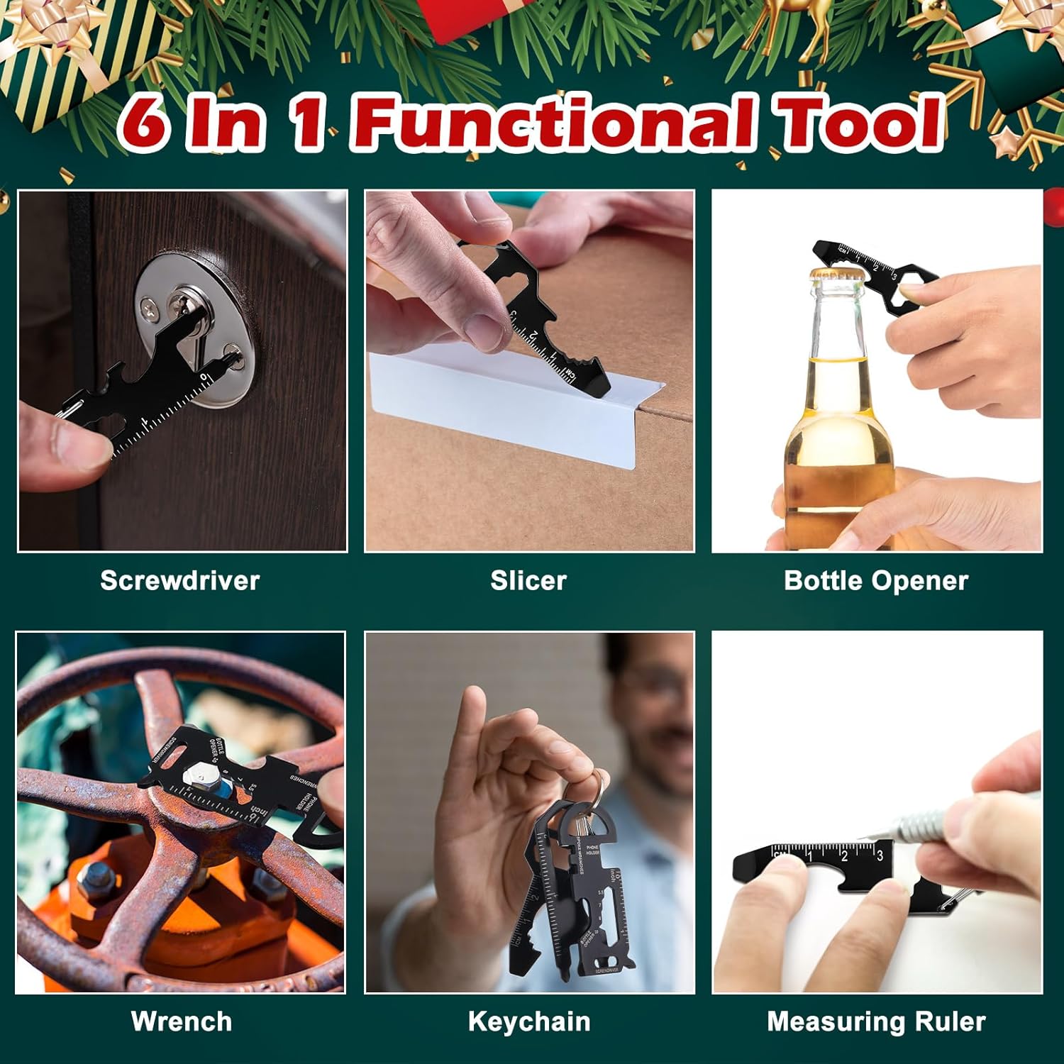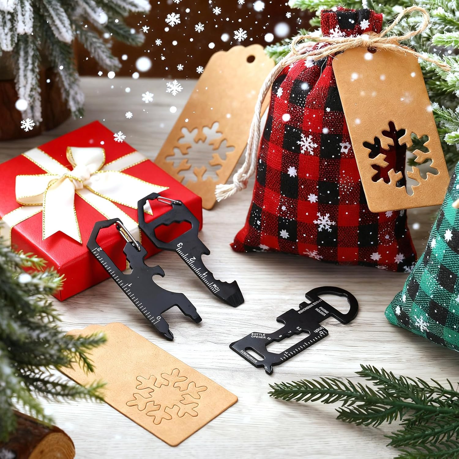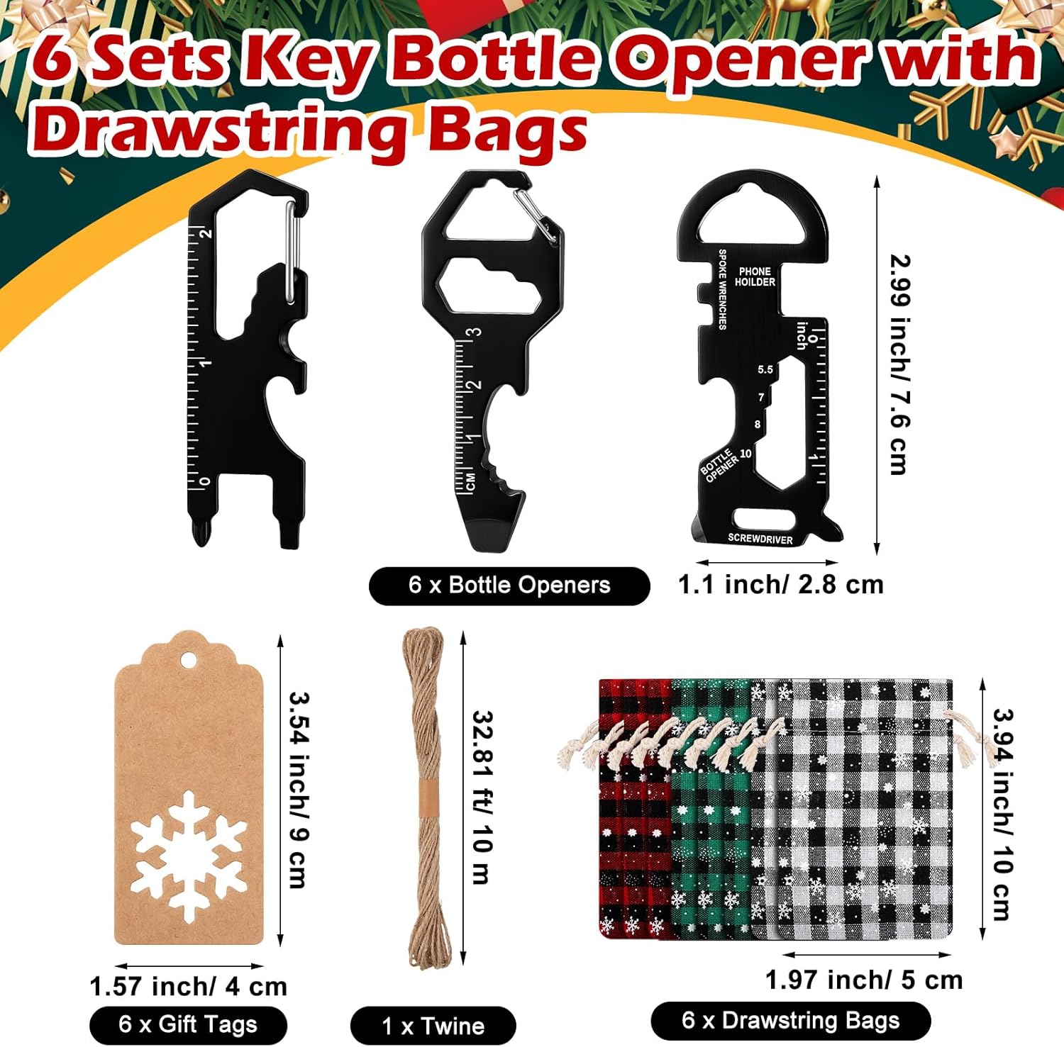 Reliable Material: this Xmas keychain multi-tool gift beer bottle opener is made of stainless steel with a smooth surface, strong and sturdy, not easy to fade or rust, strong enough for daily use, and can be easily hung on keys, backpacks or belts; The Christmas drawstring gift bag is made of cotton and linen with fine workmanship, not easy to fade or tear, and equipped with a drawstring for a secure seal