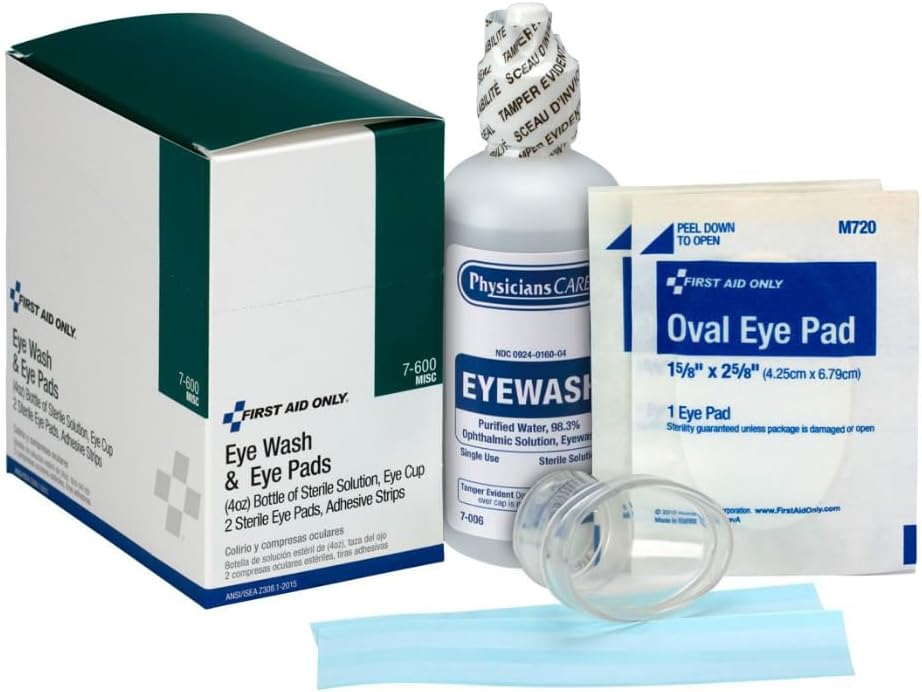 All-In-One Emergency Eye Wash Kit: Stay prepared with our 6-piece kit that includes 4 oz. of eye wash solution, 2 non-stick gauze pads, 2 adhesive strips, and an eye cup for eye wash for immediate eye relief and protection; Bottle is for single use only