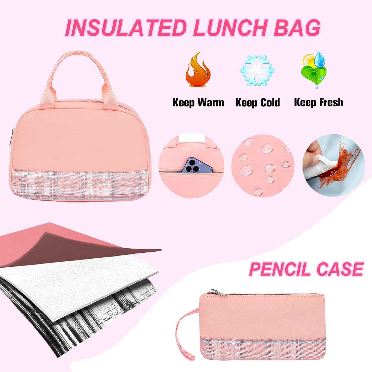 【Lunch Bag and Pencil Case】This portable lunch bag has good thermal insulation performance, which can keep food hot or cold, and keep food fresh and delicious. 1 large main compartment has an insulation coating inside, which can accommodate lunch boxes, water bottles, etc. It is durable and easy to clean; this pen pouch bag adopts the same plaid design, which is cute and simple, with large capacity, can hold many small items, and can also store cosmetics, etc., adding color to your life