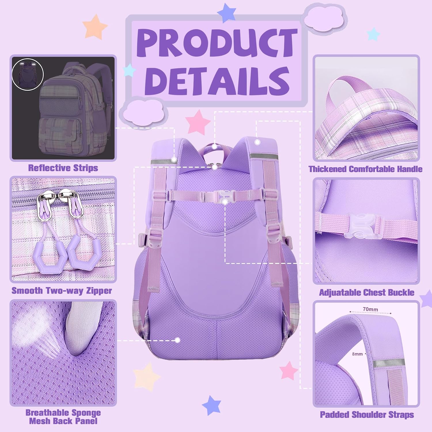 【Perfect gift for family】If you choose this six-piece set as a birthday surprise gift or holiday gift for your family, daughter or niece, she will get 1*Double Soulder Backpack+1*Lunch bag+1* Pencil Case+1 *keychain+1* Coin Purse+1* Mood Energy Brooch. She will be attracted by the beautiful plaid print and will carry them with her on vacation, picnics, camping, travel and other outdoor activities to become the focus of attention.