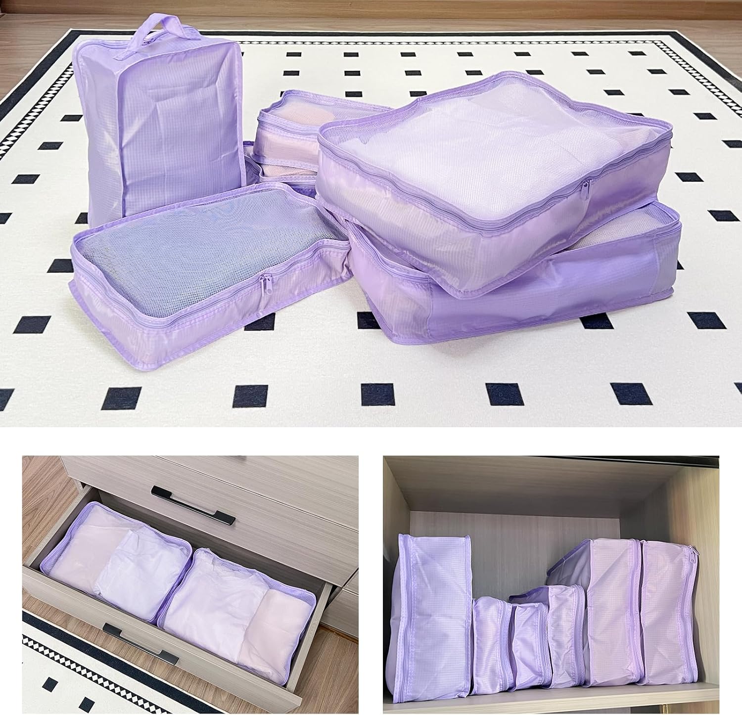 SET OF SIX: The packing cubes for carry on are multifunctional, includes 2 large suitcase clothes storage bag, 1 medium cloth storage cubes, 2 small travel socks/bra bag and 1 travel shoe bag. You can choose any combination that works best for your needs, especially suitable for 22 inch suitcase