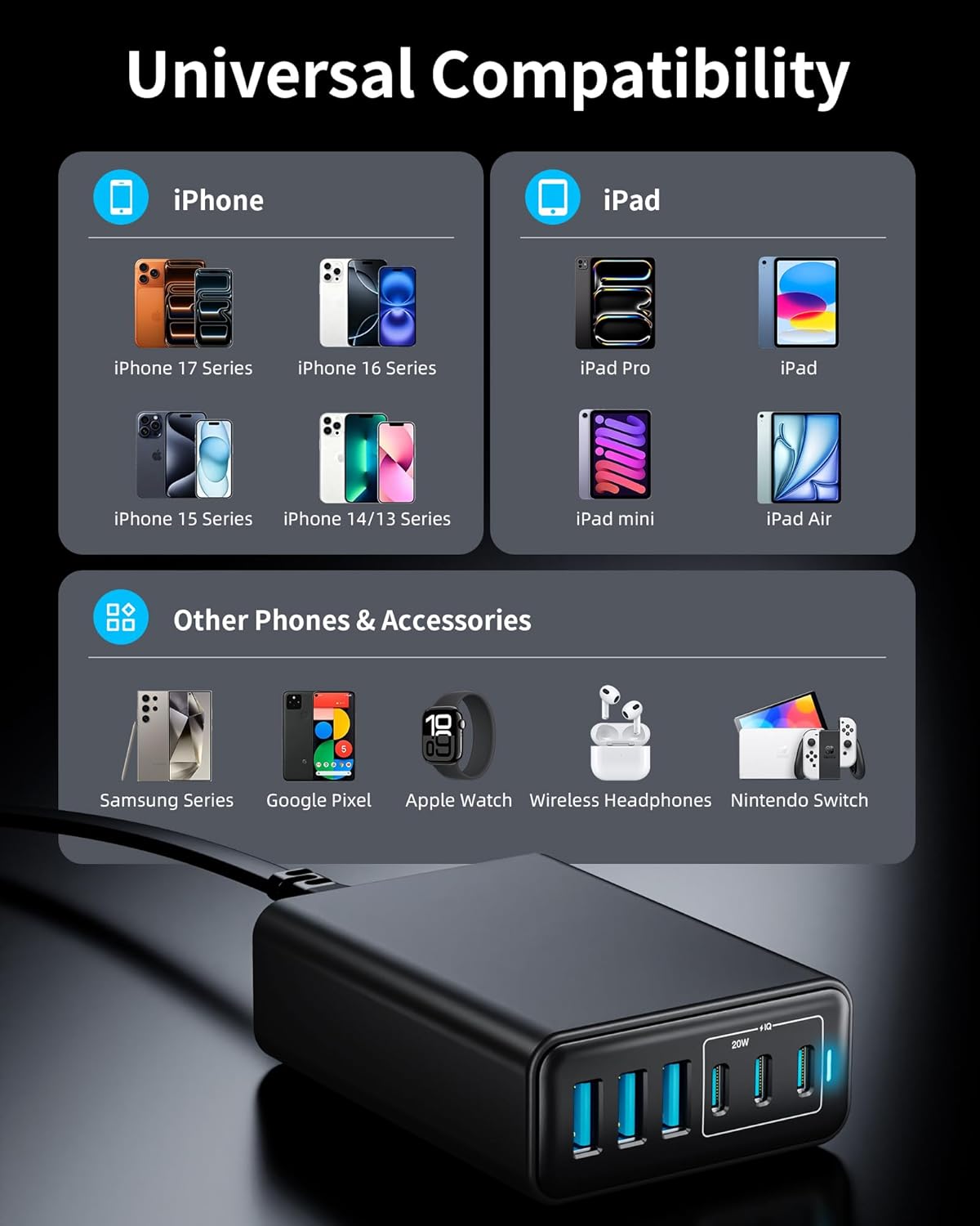 ⚡【Universal Compatibility】Compatible with a variety of devices, including iPhone models from the 17 series to the 8 series, iPad Pro/Air/Mini, AirPods Pro, Samsung Galaxy models from S23 to S10, Galaxy Z Fold, A series, Book S, Tab S series, and more, such as switches, fans, speakers, and lamps. Note: Not suitable for laptops.