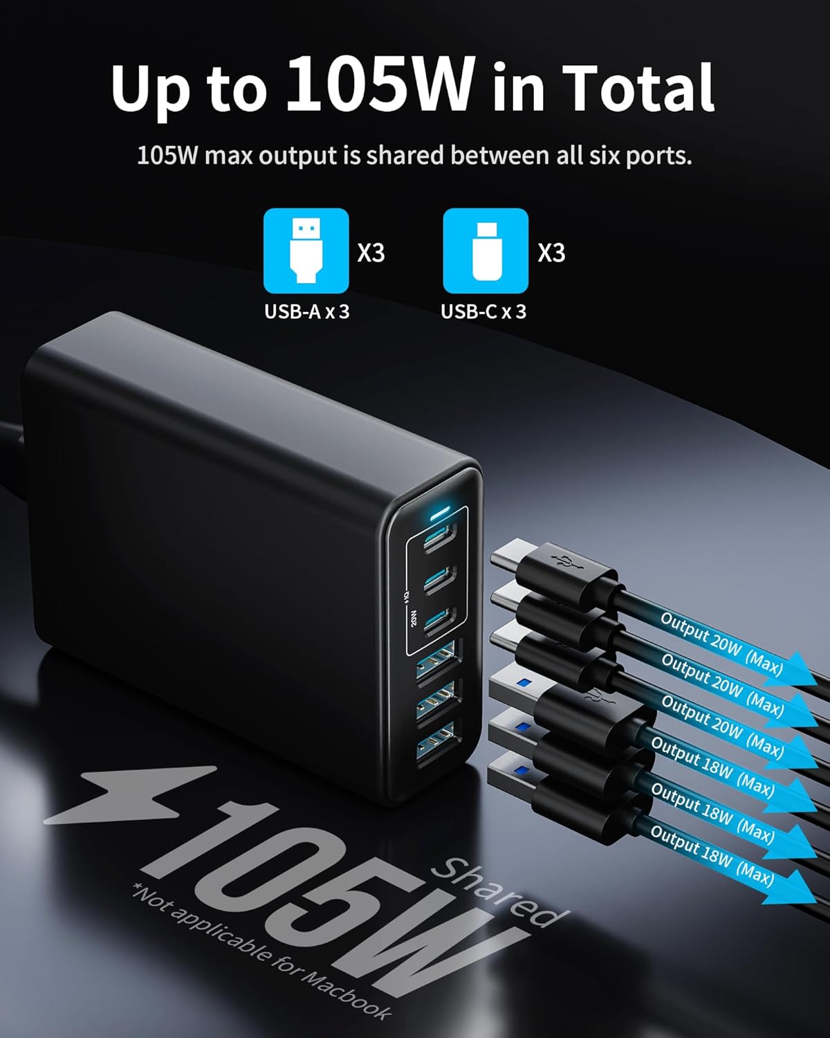 ⚡【105W Multi-Device Charger】Featuring 3 USB-C and 3 USB-A ports, this charger delivers a total output of 105W, providing ample power to charge multiple devices at once.