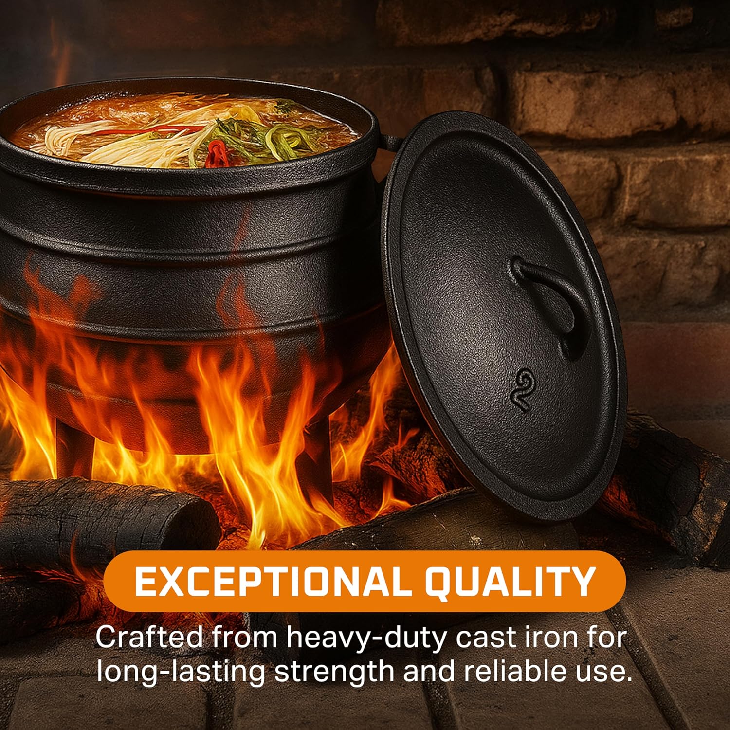 Versatile and Reliable: Use this large cauldron as a Dutch oven, skillet, or bakeware; part of your cast iron cookware set for preparing hearty stews, slow roasts, and rustic campfire meals anywhere