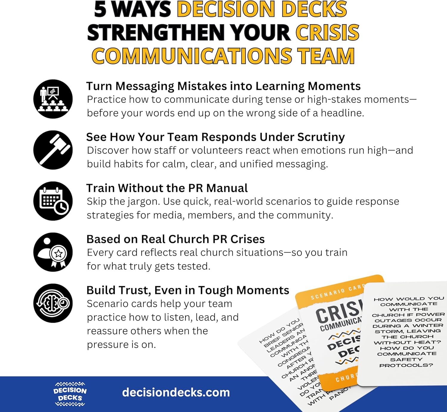 REAL-WORLD CRISIS DRILLS: 60 church-specific communication scenarios to strengthen calm, clear, and compassionate leadership.