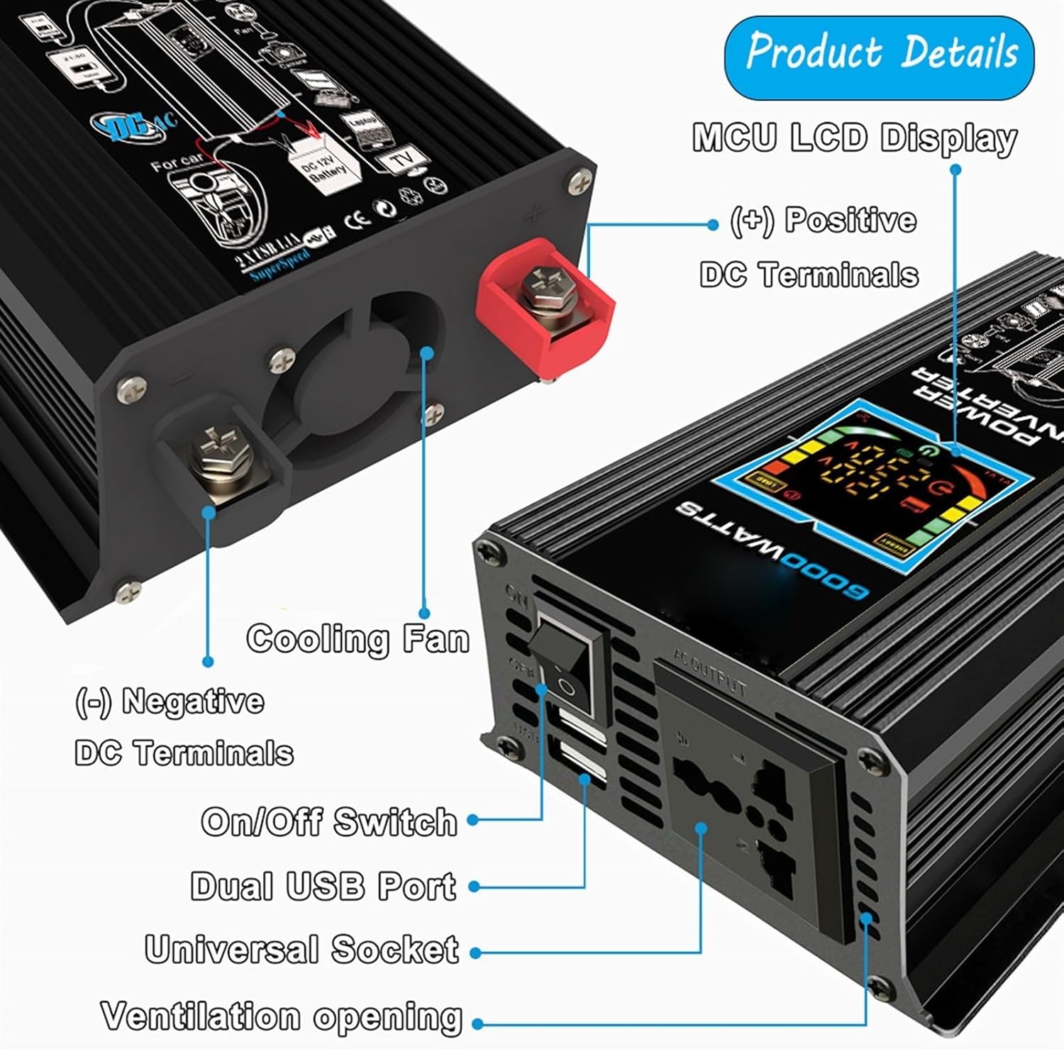 Quick charging dual USB port: Dual USB ports, you can easily charge your devices via USB charging cable. Convert DC 12V battery power to standard AC