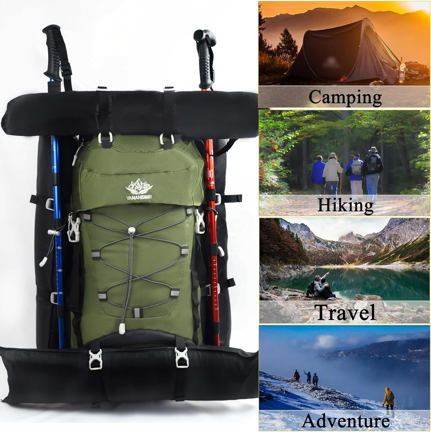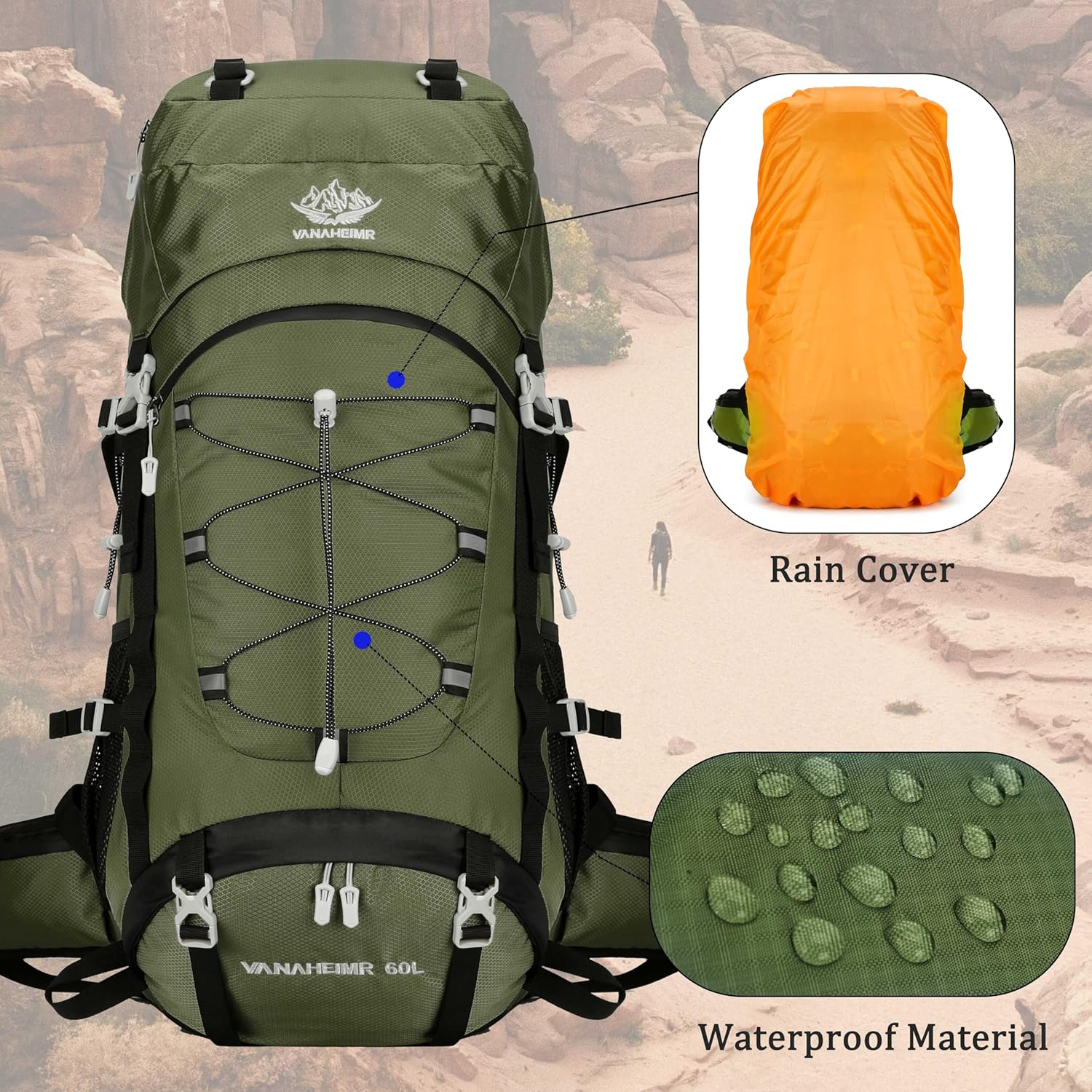 Waterproof Material: The 60L hiking backpack is made from Nylon, very light weight material and strong water resistant and anti-scratches.
