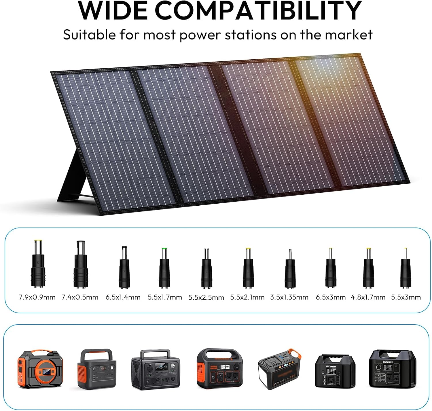 WIDE COMPATIBILITY & FAST CHARGING: Equipped with 1*DC Output 12-18V/3.3A max, 2*USB QC3.0 and 1*Type C output 5V/3A, 9V/2A,12V/1.5A, and 10-in-1 connector kit, this flexible folding solar panel provides faster charging speed and has a wide compatibility to power your phones, power banks, tablets, laptops, GPS, digital cameras and most portable power stations and solar generators.