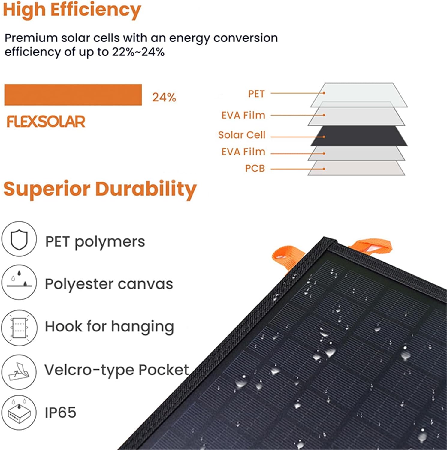 【Highly Eiificient/Uperior Durablity】Premium 60W portable solar panel with an energy conversion efficiency of up to 24%, Industrial-strength PET polymers and rugged polyester canvas provide lasting durability to protect against unpredictable weather conditions.