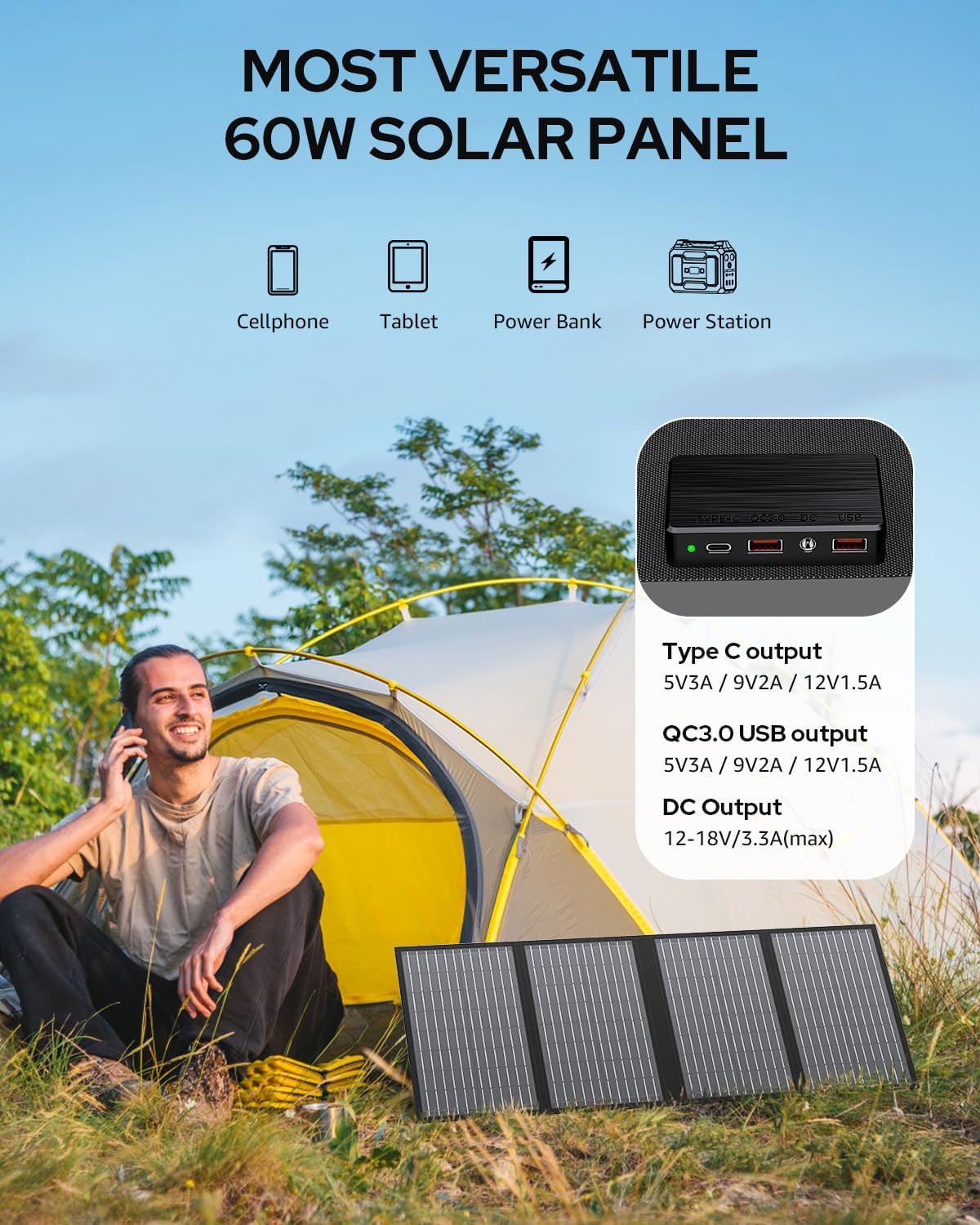 WIDE COMPATIBILITY & FAST CHARGING: This solar panel charger equipped with 1*DC Output 12-18V/3.3A max, 2*USB QC3.0 and 1*Type C output 5V/3A, 9V/2A,12V/1.5A, and 10-in-1 connector kit, this flexible folding solar panel provides faster charging speed and has a wide compatibility to power your phones, power banks, tablets, laptops, GPS, digital cameras and most portable power stations.