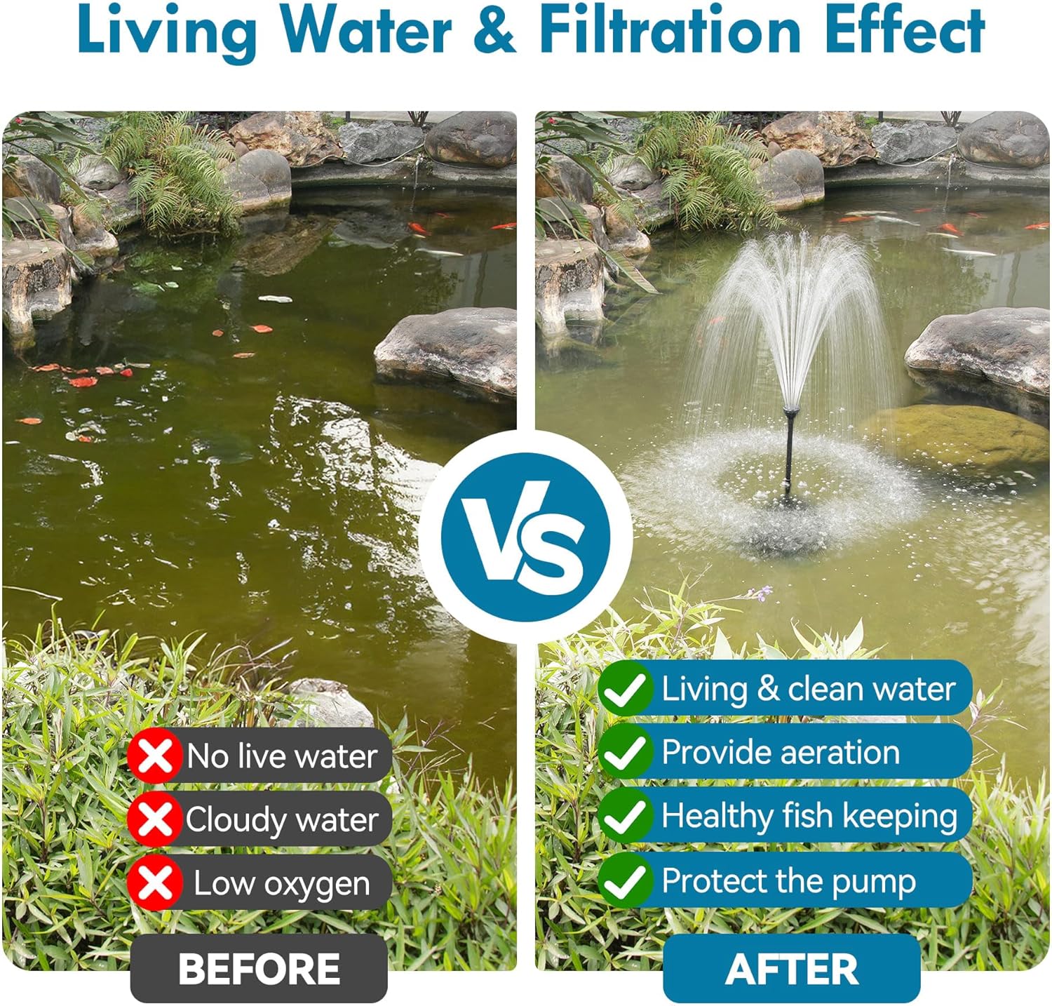 Powerful Fountain Pump: The maximum water output of the water pump is 660GPH, which is suitable for garden ponds up to 1500 gallons. The package includes a fountain kit with 3 nozzles that you can use to create beautiful water displays