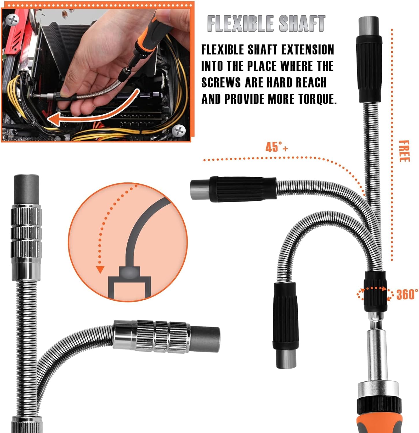 【Flexibility in use】:The torx screwdriver handle rotates 180°,equipped with a flexible extension and spring lever to help you work in hard-to-reach places.