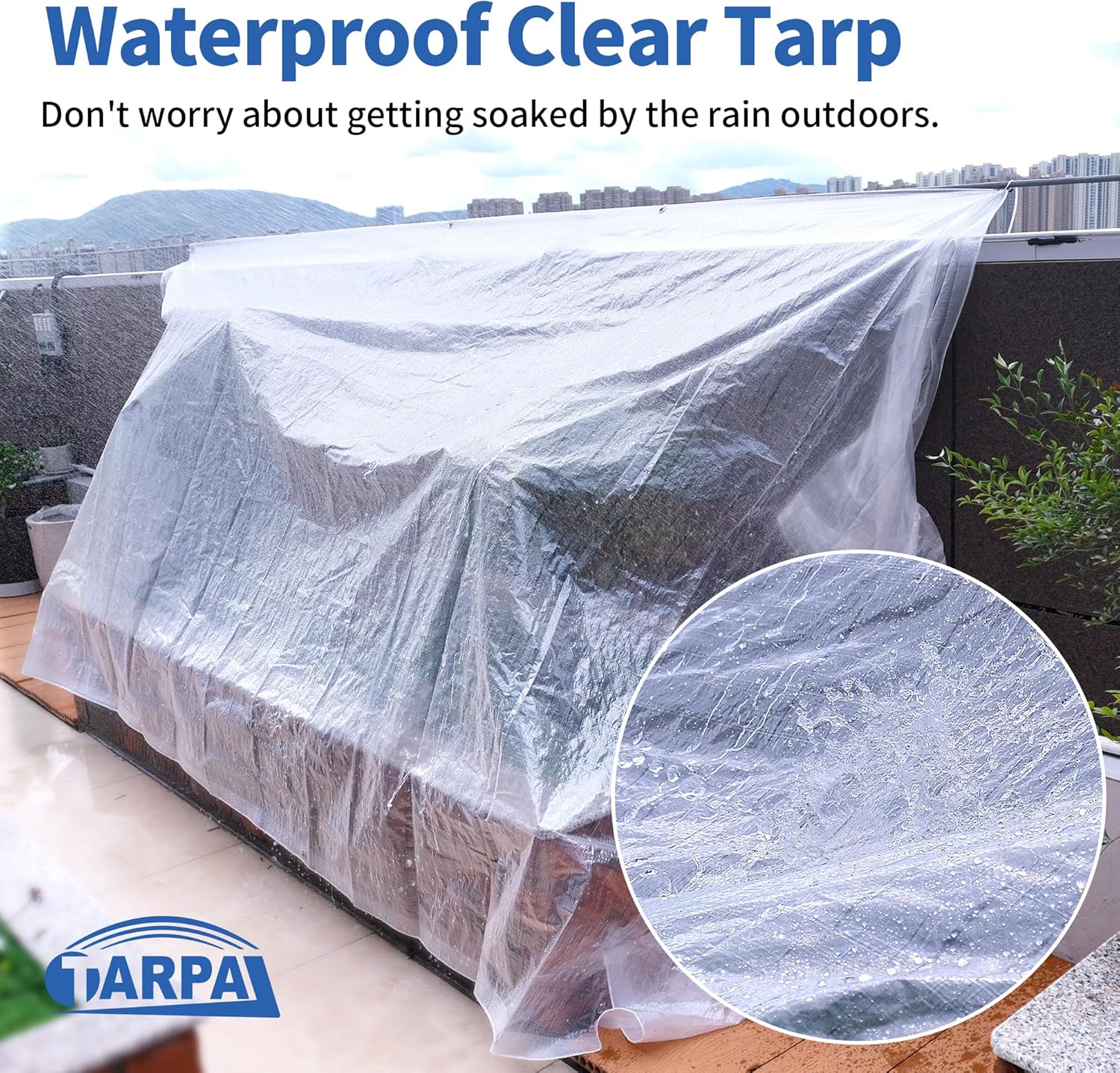 【Reinforced Grommets & Heat-Sealed Edges】: Our clear plastic tarp waterproof tarp has reinforced gaskets, one every 35.5 inches, for easy and quick fixation and use. The four sides of the fabric are heat sealed to prevent tearing and wear, enhancing durability. Lightweight materials are easy to handle and carry.