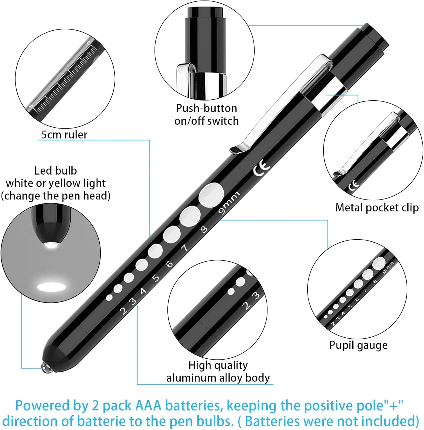 Pen Lights for Nurses: These pen ligths are made of premium aluminum alloy and LED bulb, which make sure these nurse penlights durable and long-life using. The pen light comes with replace white and yellow Led bulb, you can choose the light for different use.There are pupil gauge and a 5cm-ruler on the side of the penlight. It is very helpful for you to measure the pupil dilation and length on using these medical penlights.