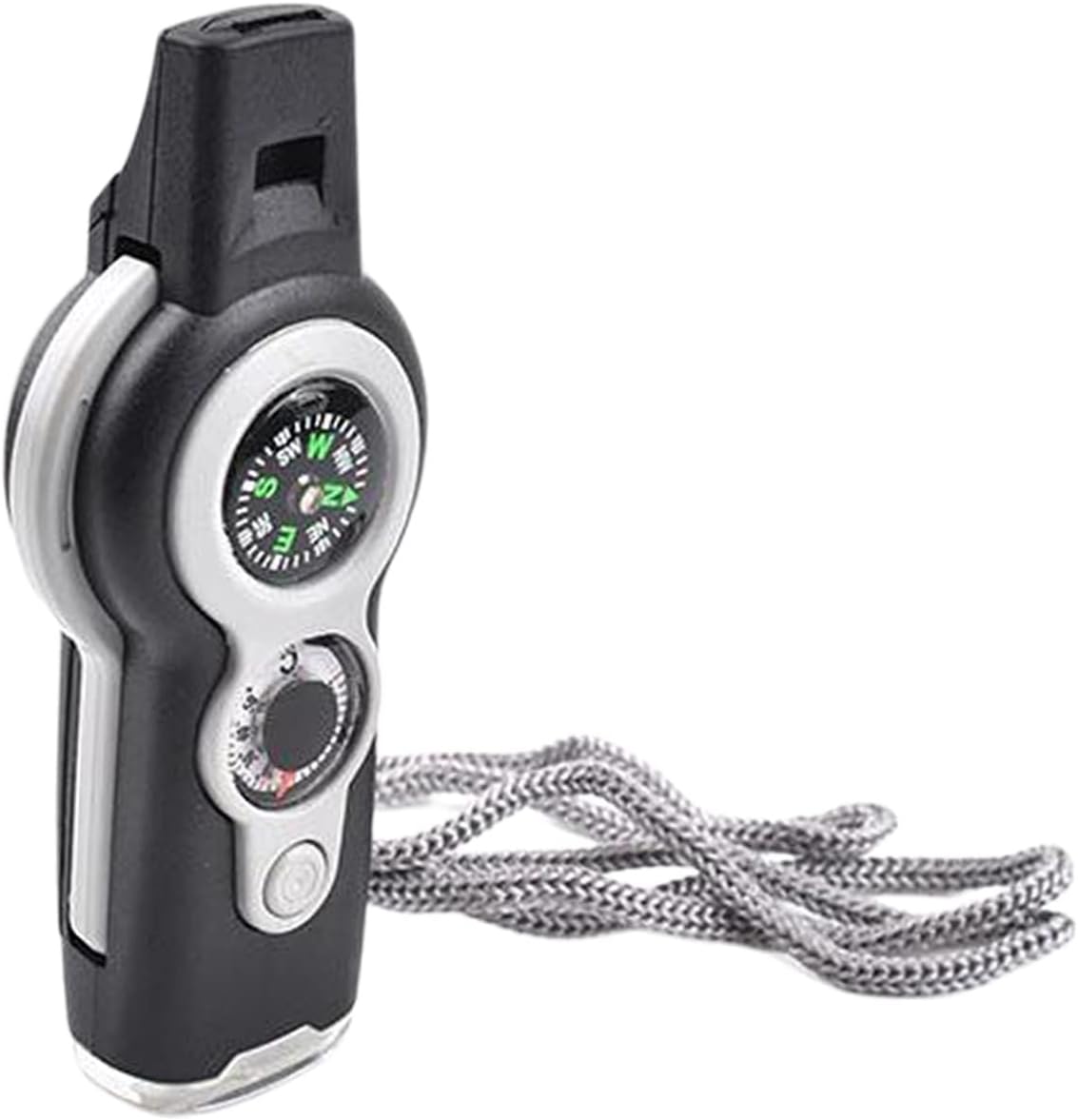 Seven functions in high decible whistle, compass, thermometer with range from -20 °C to 50 °C, magnifying glass, reflector , led light and small sealed compartment.