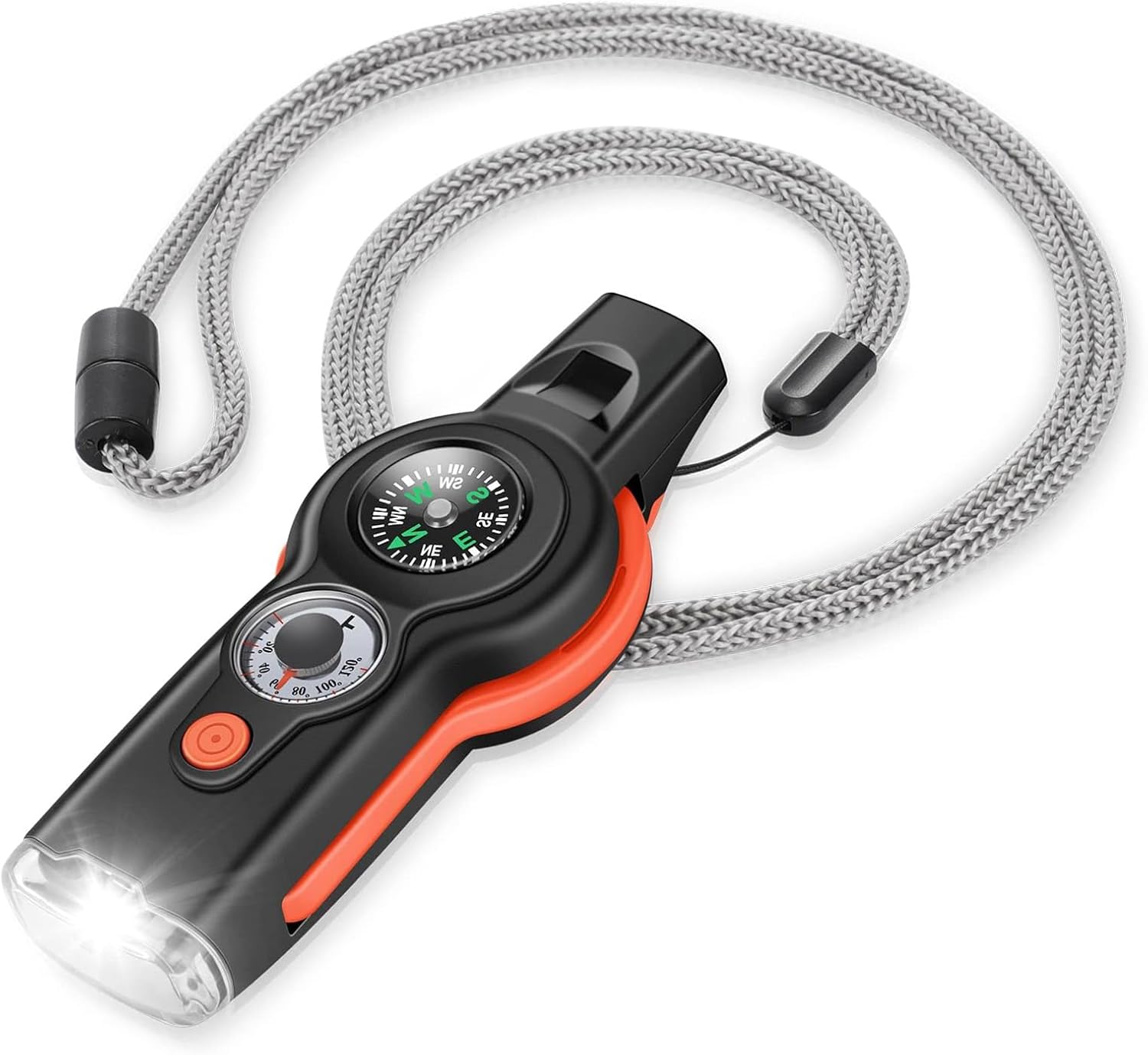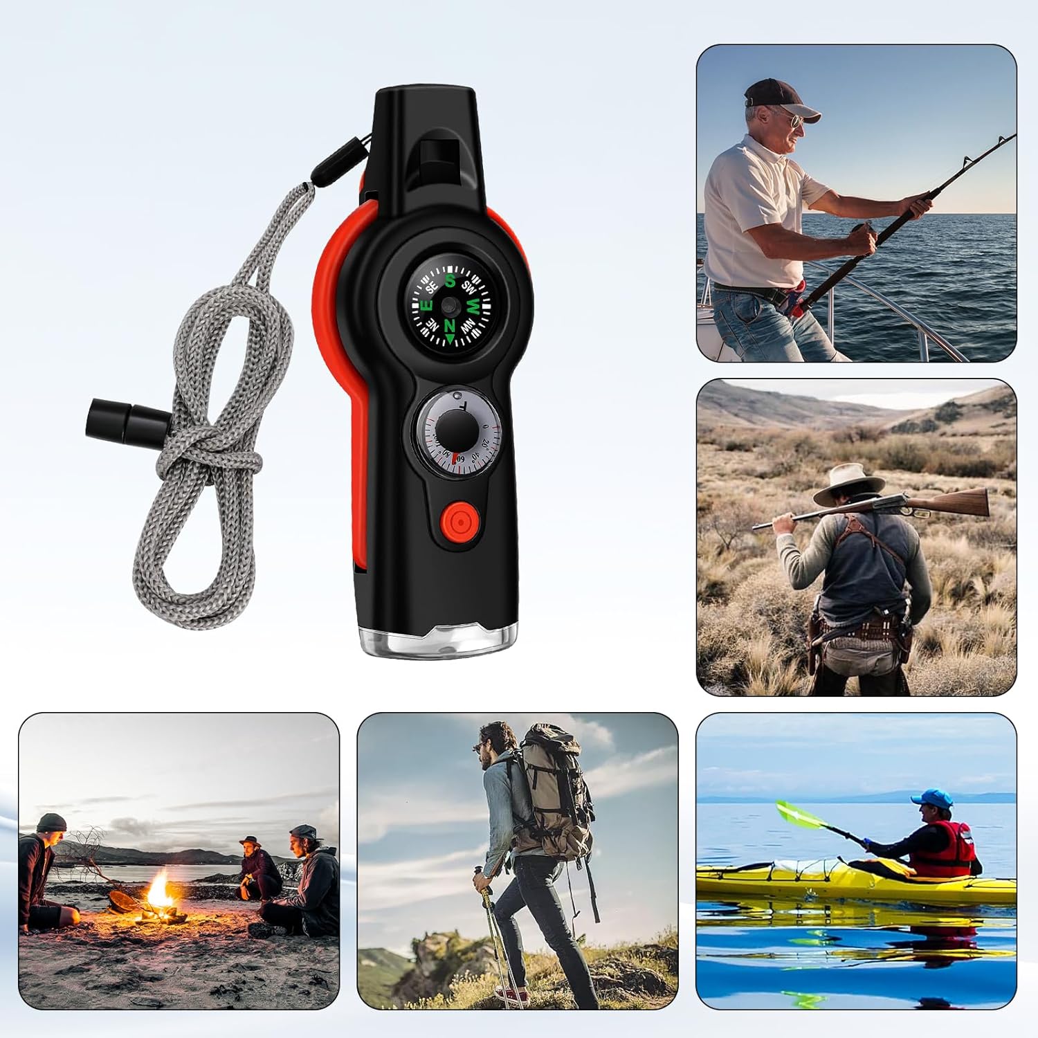 7-in-1 Multifunctional Survival Tool – Combines a high-decibel emergency whistle, compass, thermometer, fire starter, flint scraper, signal mirror, and waterproof storage compartment. Perfect for tackling diverse challenges in the wild with one compact device.