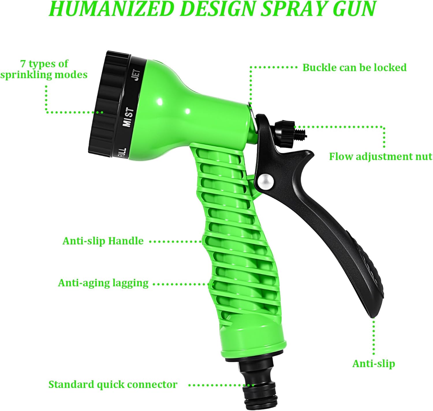 Ergonomic Design: The nozzle is ergonomically designed with a non-slip handle and a lockable latch, and a 360-degree rotating head, making it time-saving and effort-reducing to operate
