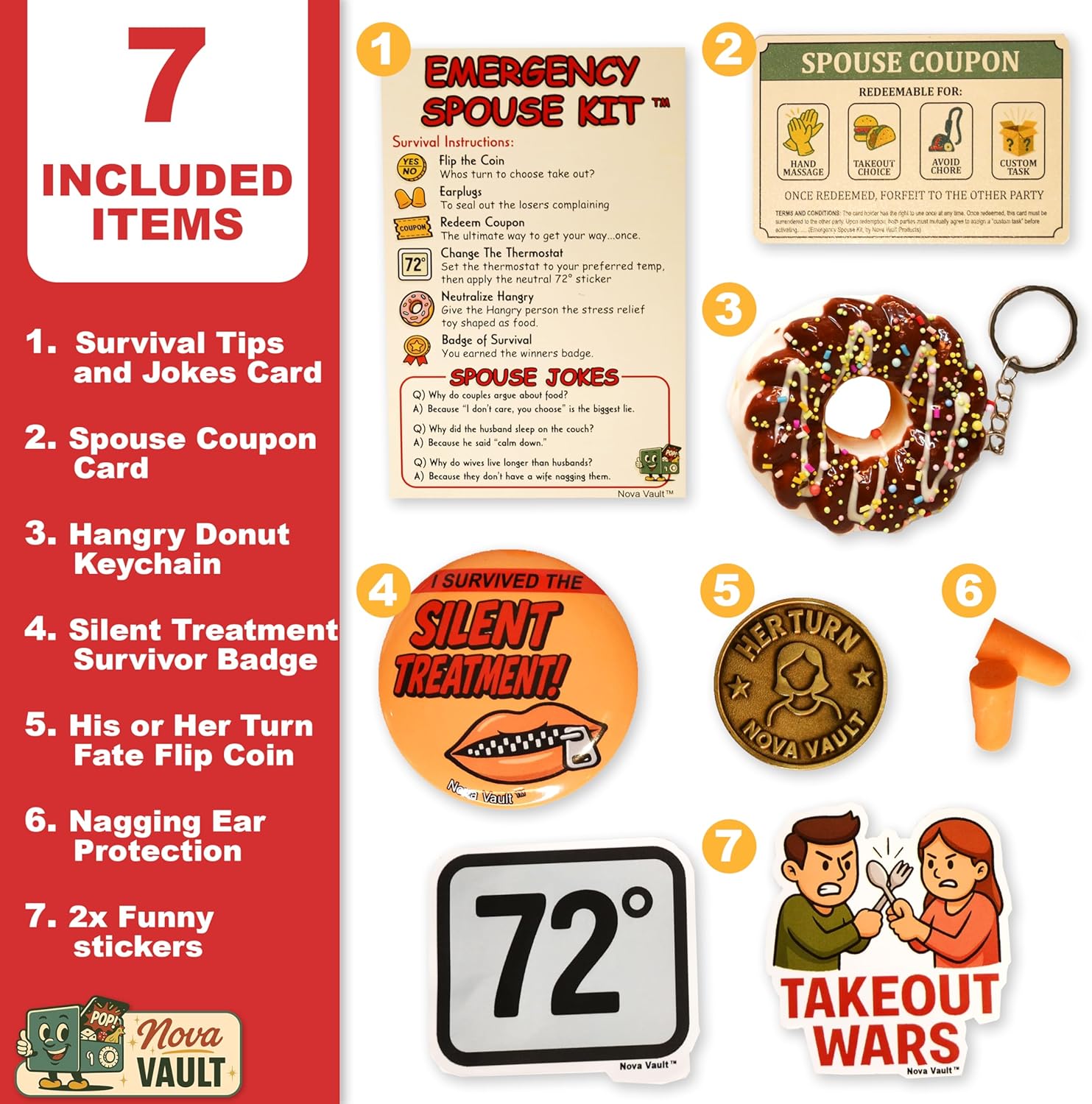 WHAT’S INSIDE (7 PARODY ITEMS) – Noise Ear Plugs, Partner Coupon, Stickers, Fate Flip Coin, Button Pin Badge, Motivational Card, Snack Squeeze Toy.