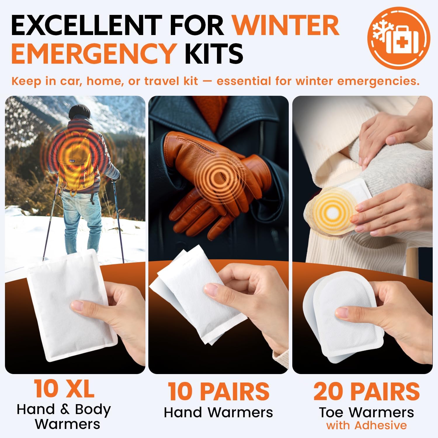 CONTAINS:10 Pairs Hand Warmers, 20 Pairs Toe Warmers with Adhesive, 10 XL Hand & Body Warmers