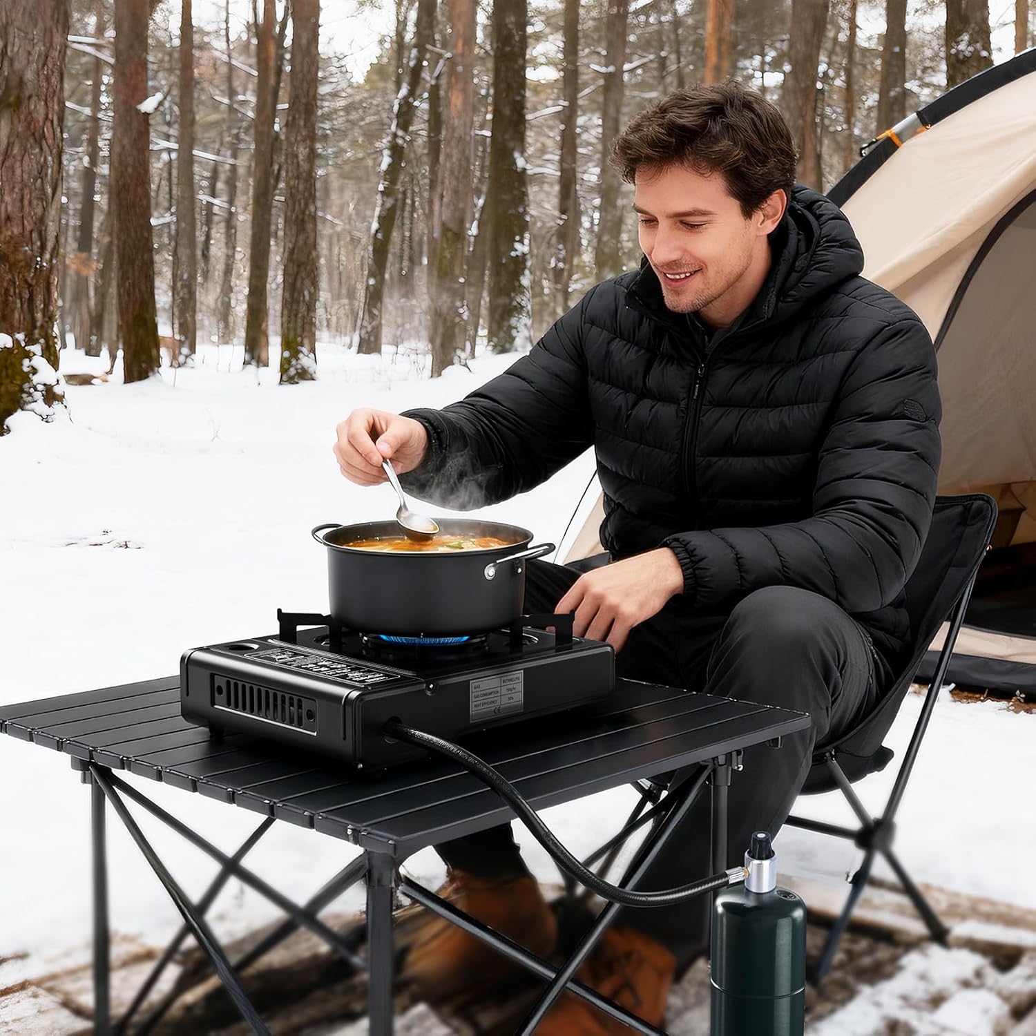 【Powerful 7800 BTU Output】 Compact size with strong heating: boils water in minutes. Pairs well with outdoor pots, pans, and kettles, delivering efficient heat for fast outdoor cooking