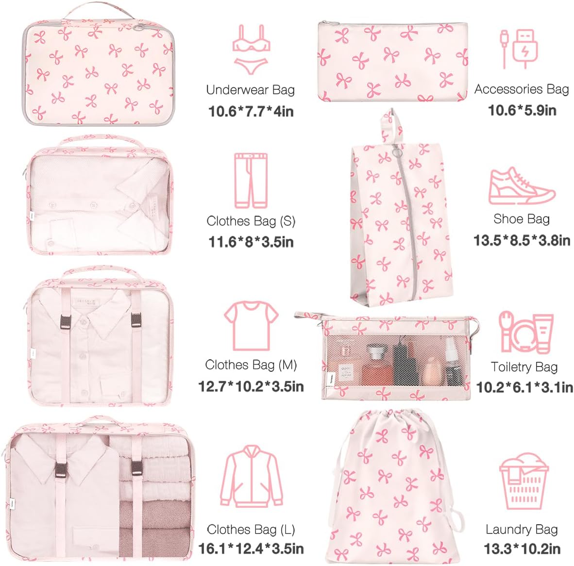 8 Piece Packing Cubes: Our suitcase organizer bags set come in various sizes to accommodate all your essentials, from clothes and shoes to cosmetics and electronics. The travel bags organizer for luggage make anything organized